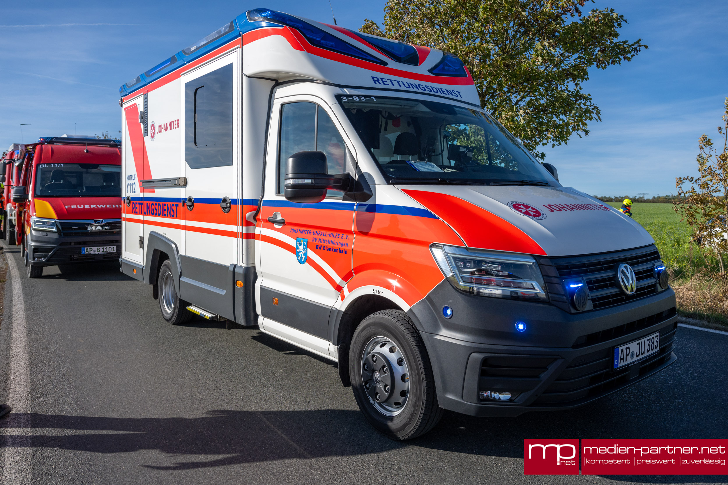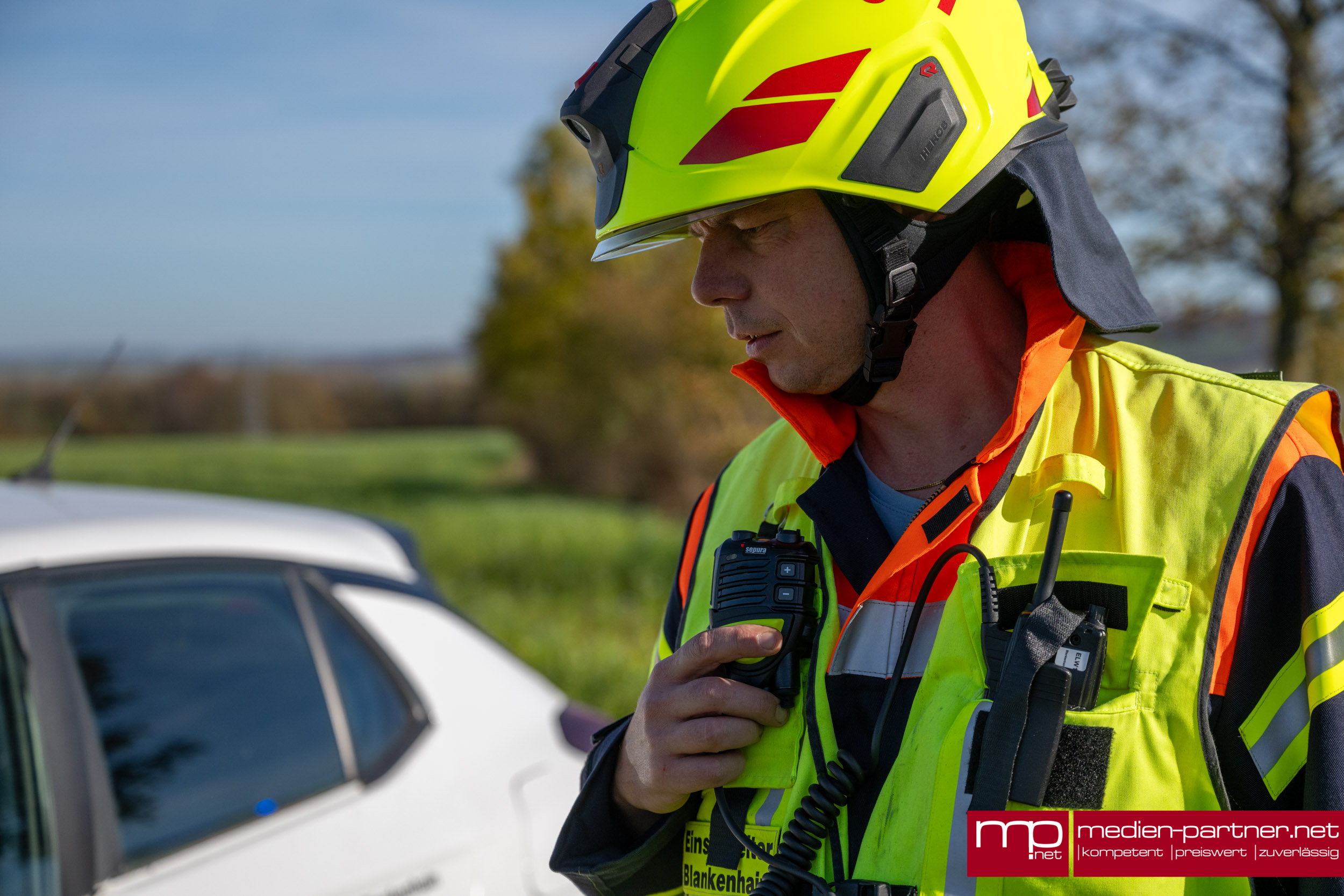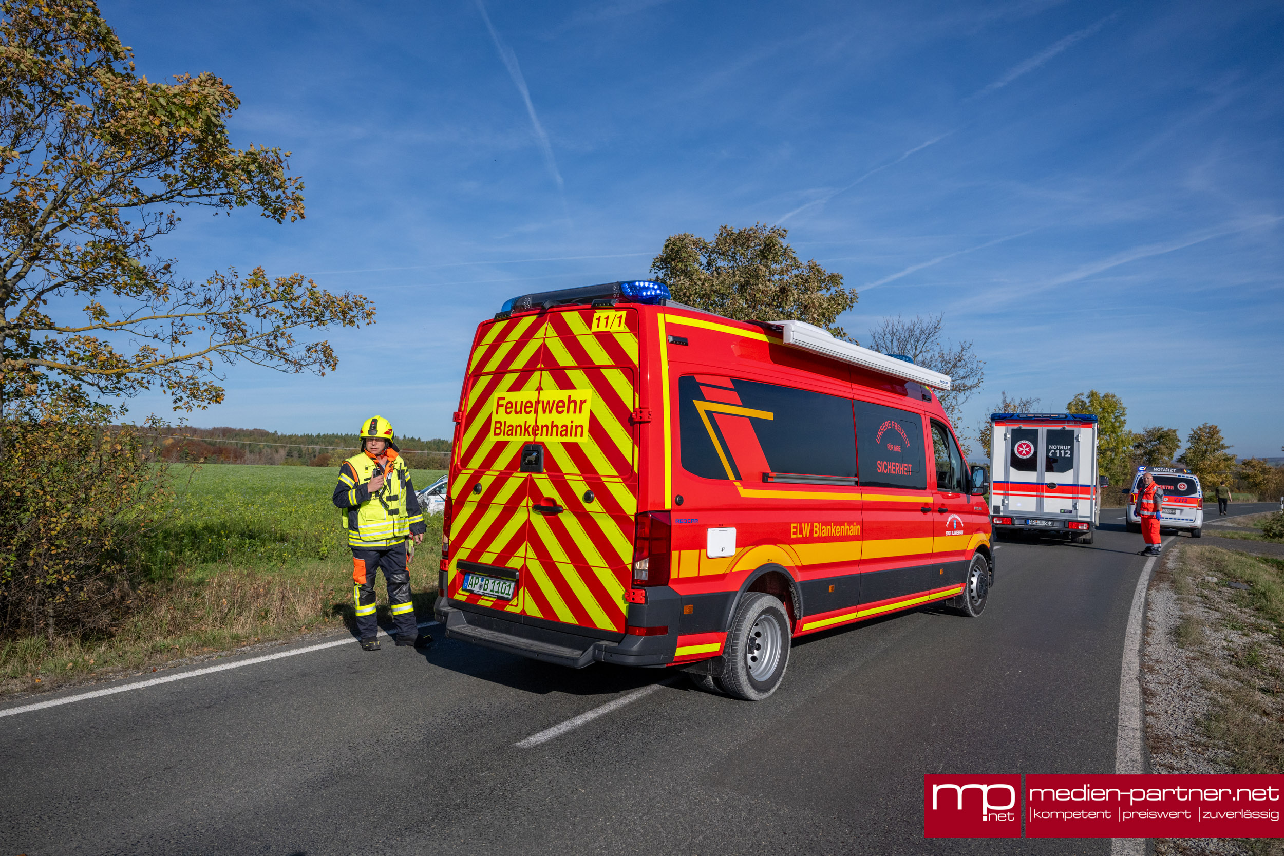 Die Frau war auf dem Weg zu einem pflegebedürftigen Menschen, als es zu dem Unfall kam. Vor Ort kümmerten sich sofort herbeigeeilte Ersthelfer um sie, bis der Rettungsdienst eintraf. Die Freiwillige Feuerwehr Blankenhain sicherte die Unfallstelle ab und stellte den Brandschutz sicher. So öffneten die Einsatzkräfte die Motorhaube des Fahrzeugs und klemmten die Batterie ab. Auslaufende Betriebsstoffe wurden mit Bindemittel aufgefangen.