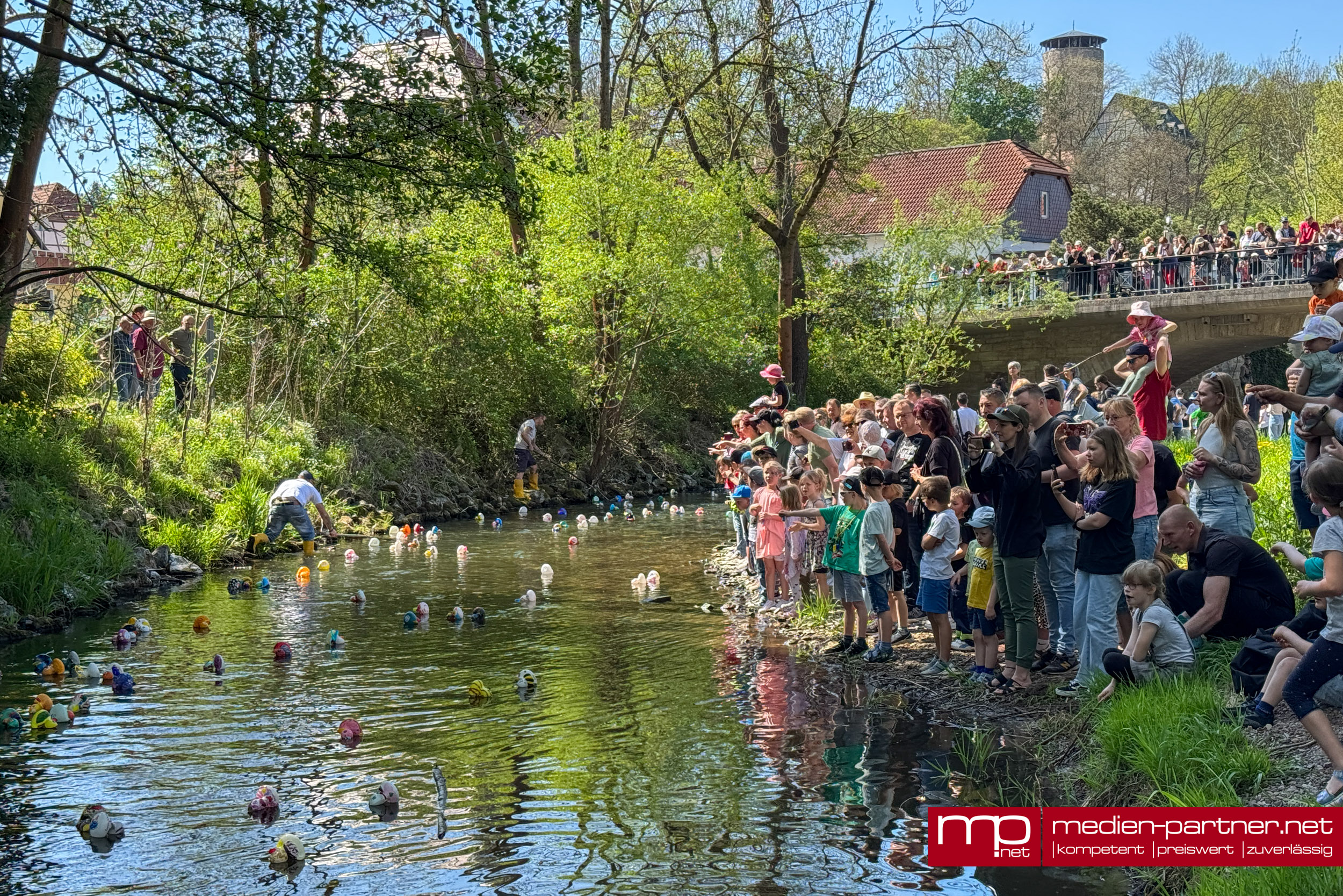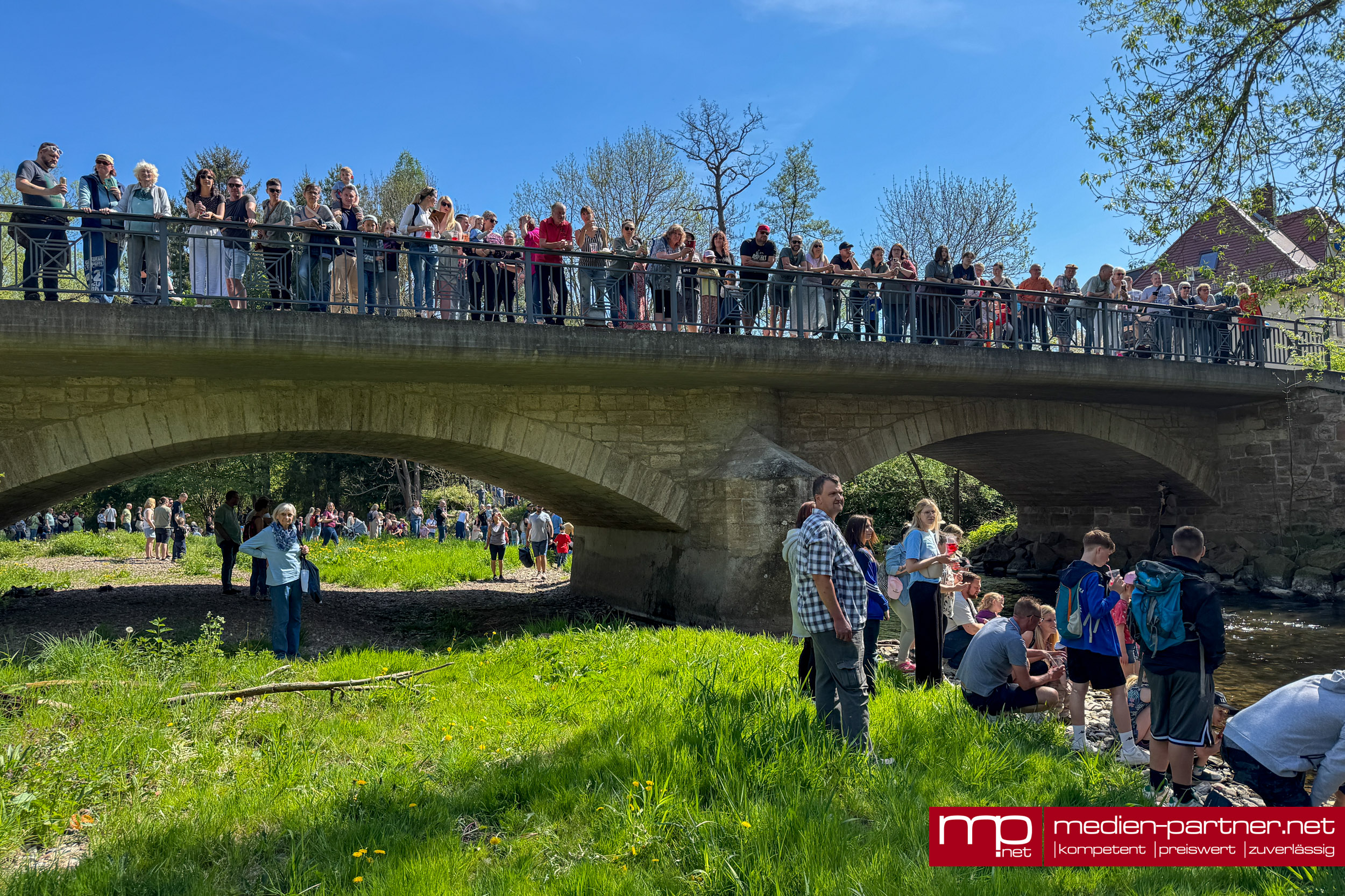 Wie schon im Vorjahr war das Entenrennen Teil des Maibaumsetzens der Freiwilligen Feuerwehr Tannroda, die das Fest mit Bratwurststand, Getränken, Hüpfburg und Spielen unterstützte. „Die Zusammenarbeit mit der Feuerwehr war wieder großartig“, betonte Singer.