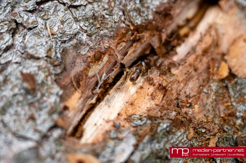 Erkennbar ist ein Befall oft nur an kleinen Zeichen: braunes Bohrmehl am Stammfuß, Harzfluss oder abgeplatzte Rinde. Auch Spechte sind ein Hinweis – sie schlagen gezielt auf Larven ein. „Wenn man solche Anzeichen sieht, muss der Baum gefällt und schnell aus dem Wald gebracht werden. Sonst entwickelt sich darunter die nächste Generation.“