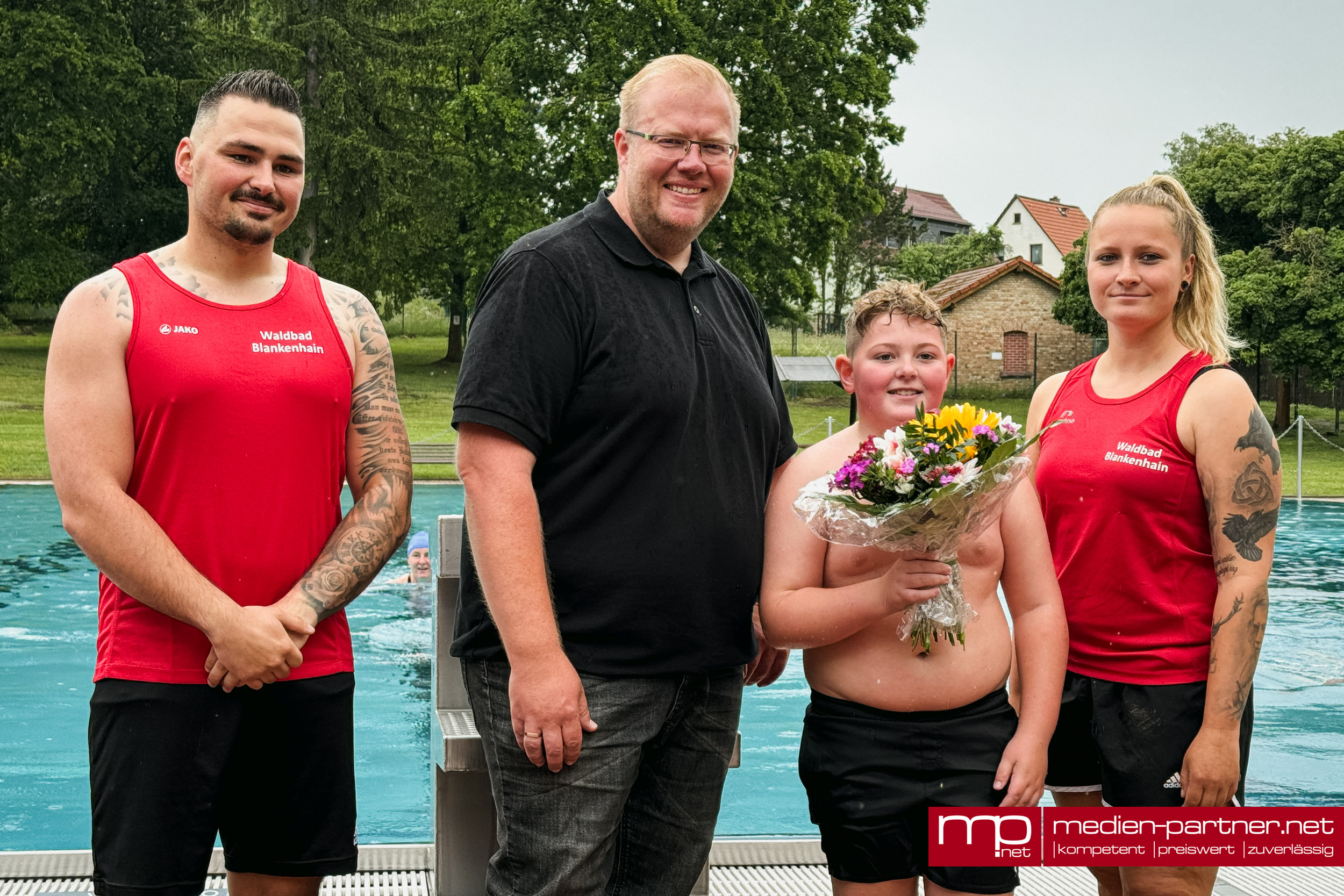 Mit einem symbolischen Akt eröffnete am Sonntagmorgen um Punkt 10 Uhr der zweite Beigeordnete der Stadt Blankenhain, Stefan Eberhardt (CDU), die diesjährige Freibadsaison im Waldbad. Bereits vor Öffnung der Tore hatten sich gut ein Dutzend Badebegeisterte eingefunden, um sich als Erste ins kühle Nass zu stürzen.