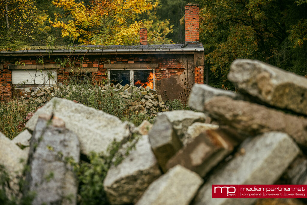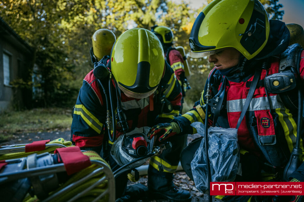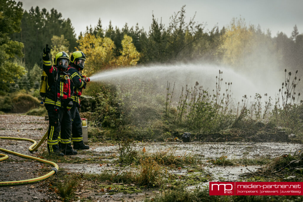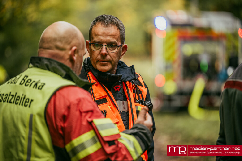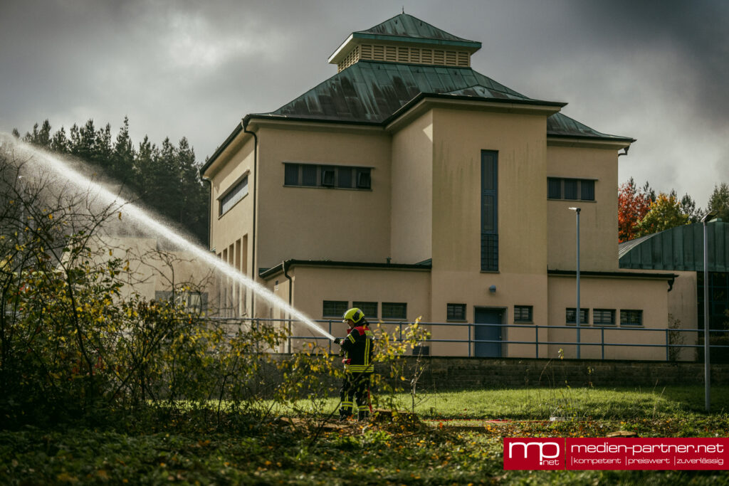 (Bad Berka) Ein dichter Rauchschleier über dem ehemaligen Bauhofgelände, Sirenen heulen, Feuerwehrfahrzeuge eilen durch den Wald, oberhalb der Trebestraße in Bad Berka: Was am Samstagvormittag wie ein echter Großeinsatz aussah, war eine umfangreiche Übung der Feuerwehr Bad Berka gemeinsam mit mehreren umliegenden Wehren. Ziel war es, den Ernstfall eines Gebäudebrandes mit Übergriff auf den Wald in Kombination mit dem Schutz kritischer Infrastruktur (KRITIS) zu proben – konkret das nahegelegene städtische Wasserwerk.
