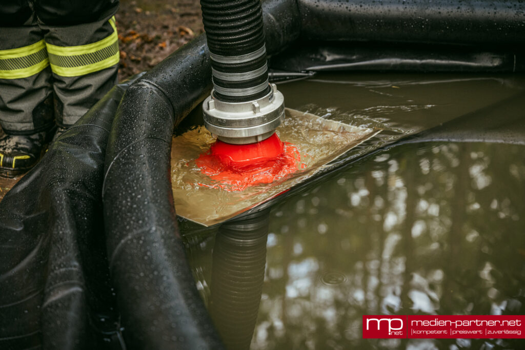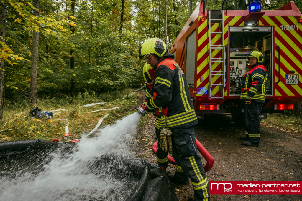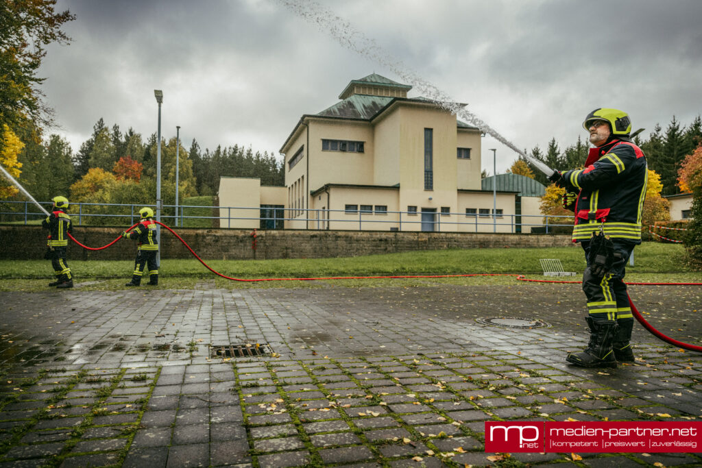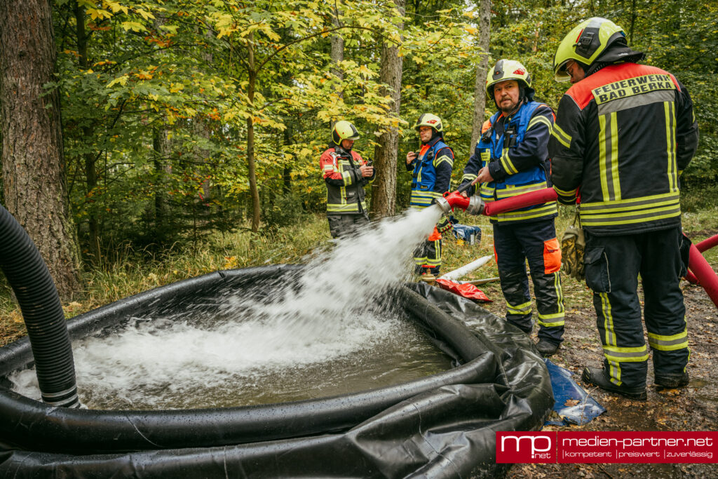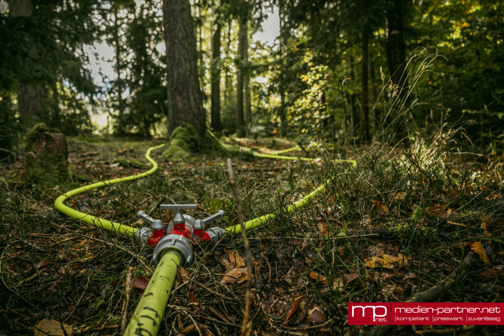 Für die Einsatzkräfte galt es, mehrere Herausforderungen gleichzeitig zu bewältigen. Im oberen Übungsabschnitt stand die Brandbekämpfung des Gebäudes und der Schutz des Wasserwerks im Vordergrund. Parallel arbeitete der zweite Einsatzabschnitt unter Leitung der von Christoph Zimmer in Unterstützung durch die Feuerwehr Blankenhain an der Wasserversorgung über eine lange Wegestrecke: Über eine fast 840 Meter lange doppelt verlegte Schlauchleitung wurde Wasser aus dem Bad Berkaer Freibad bis hinauf zur Einsatzstelle gefördert – ein logistisches und technisches Zusammenspiel, das mehrere Pumpen und präzise Abstimmung erforderte.