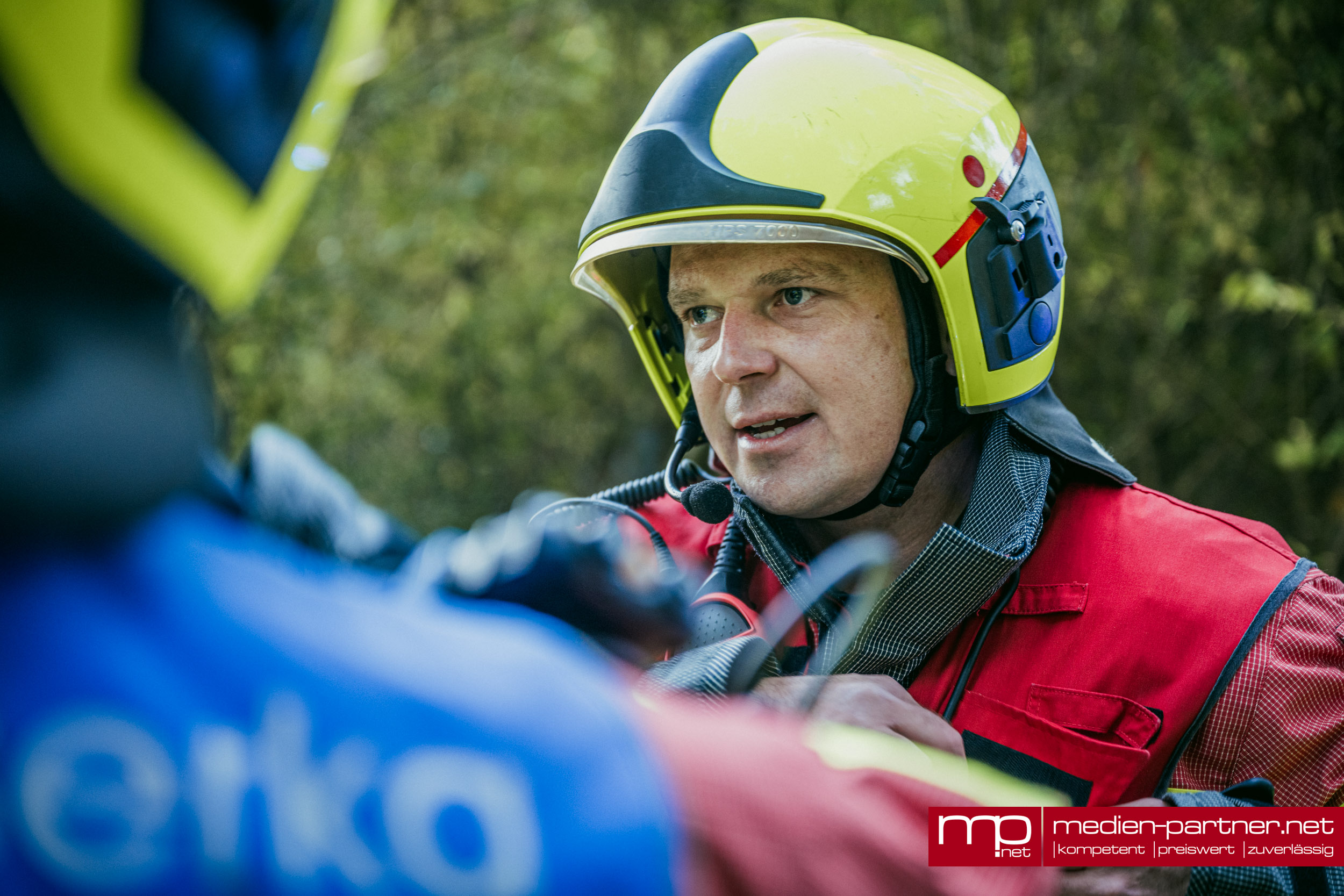 Für die Einsatzkräfte galt es, mehrere Herausforderungen gleichzeitig zu bewältigen. Im oberen Übungsabschnitt stand die Brandbekämpfung des Gebäudes und der Schutz des Wasserwerks im Vordergrund. Parallel arbeitete der zweite Einsatzabschnitt unter Leitung der von Christoph Zimmer in Unterstützung durch die Feuerwehr Blankenhain an der Wasserversorgung über eine lange Wegestrecke: Über eine fast 840 Meter lange doppelt verlegte Schlauchleitung wurde Wasser aus dem Bad Berkaer Freibad bis hinauf zur Einsatzstelle gefördert – ein logistisches und technisches Zusammenspiel, das mehrere Pumpen und präzise Abstimmung erforderte.