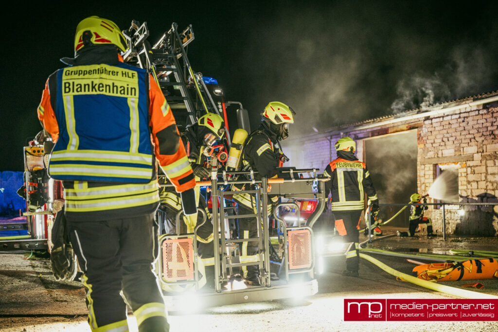 Die Feuerwehren Thangelstedt und Krakendorf begannen umgehend mit der Brandbekämpfung. Unterstützung kam kurze Zeit später aus Blankenhain, die auch die Einsatzleitung übernahm und eine lange Wegestrecke vom örtlichen Teich zur Löschwasserversorgung aufgebaute. Insgesamt waren rund 70 Einsatzkräfte mit 13 Fahrzeugen aus acht Ortsteilfeuerwehren der Stadt Blankenhain im Einsatz.