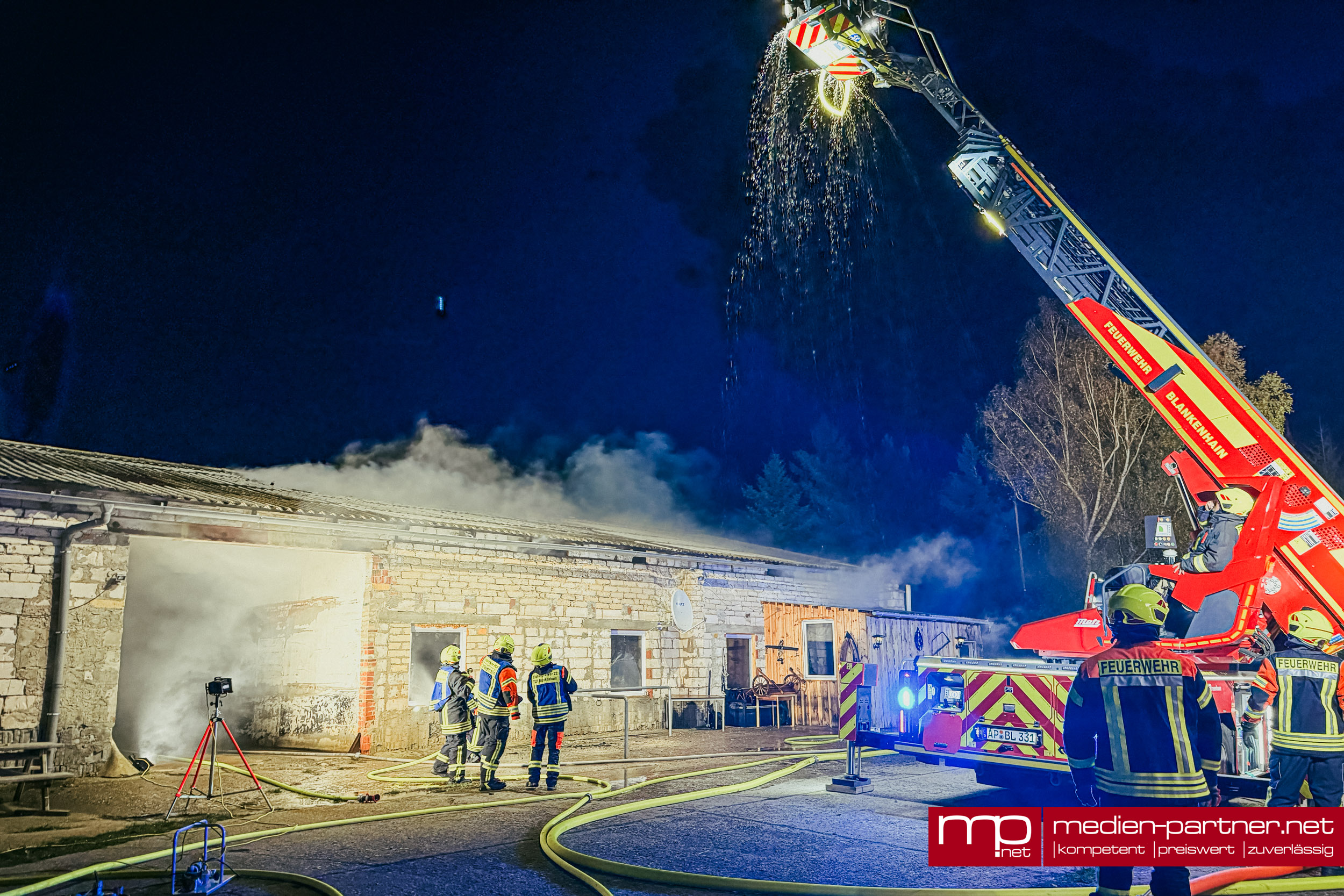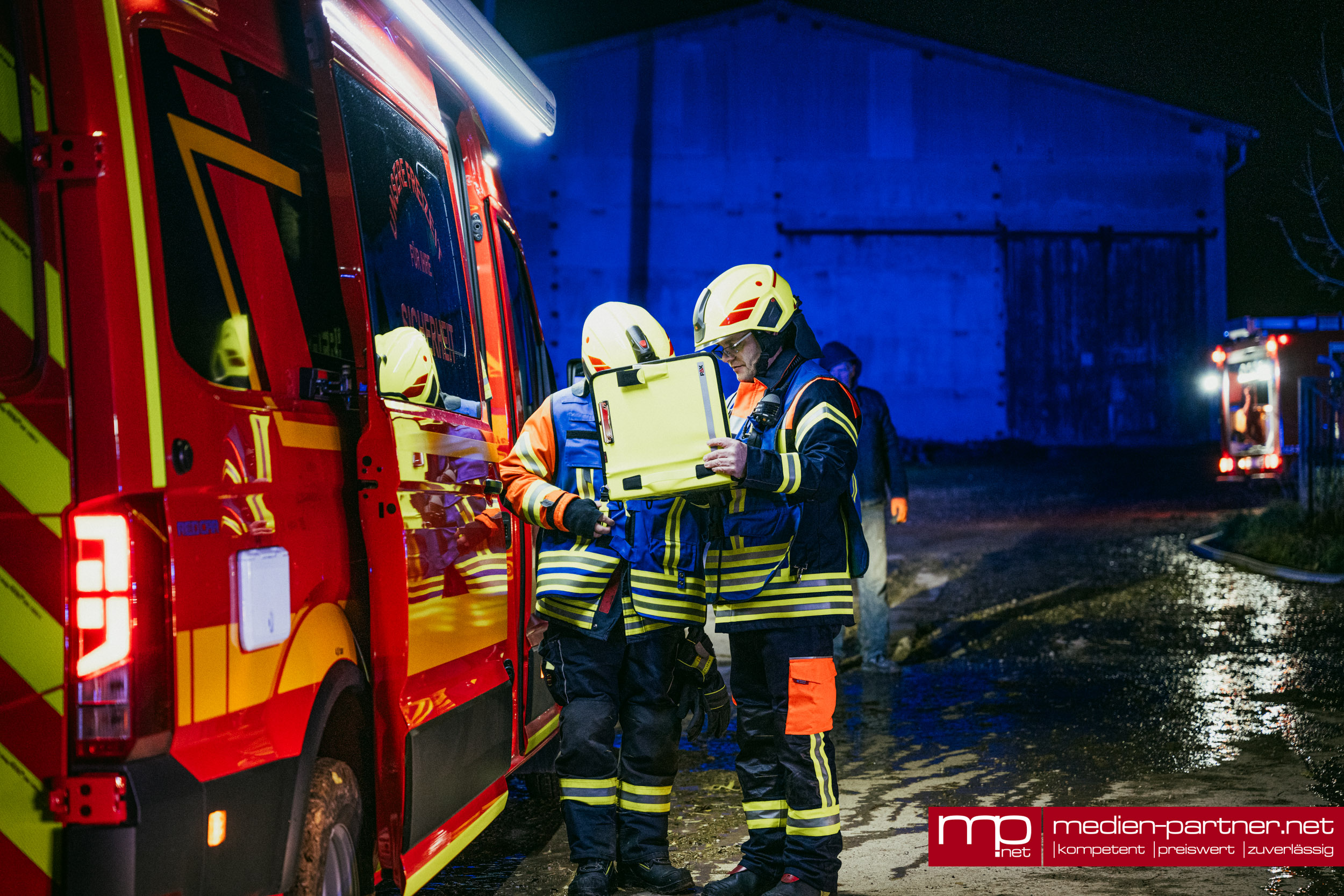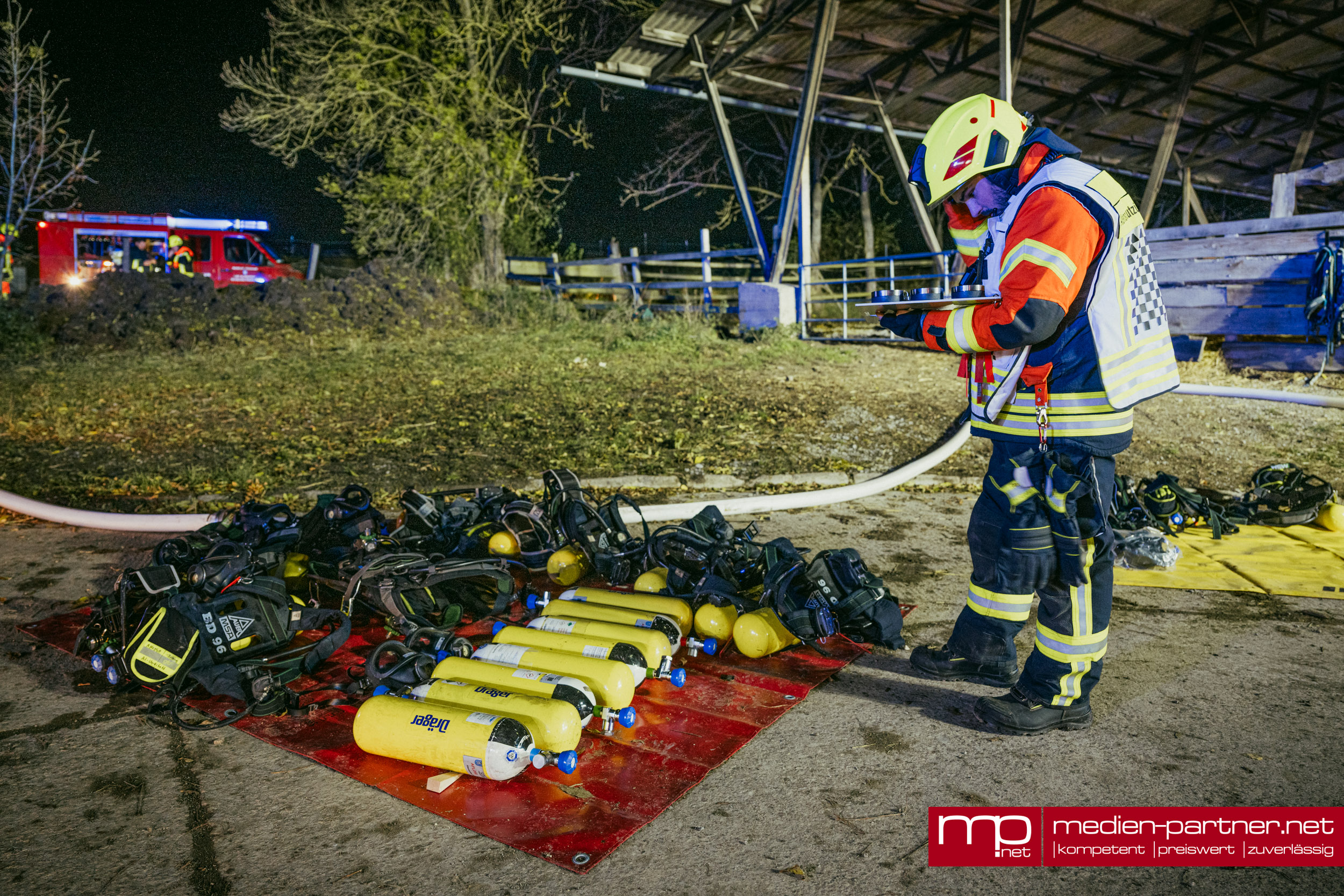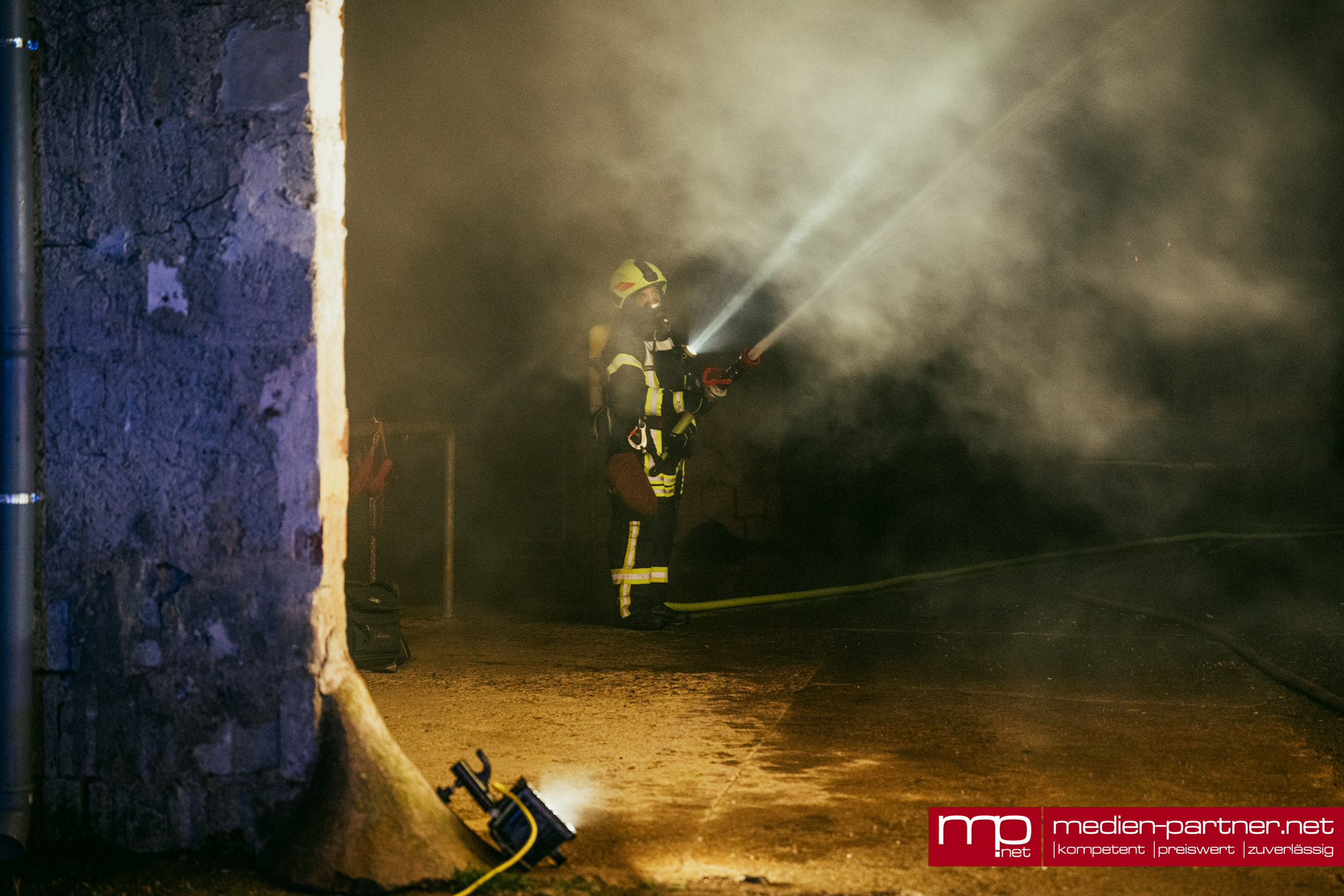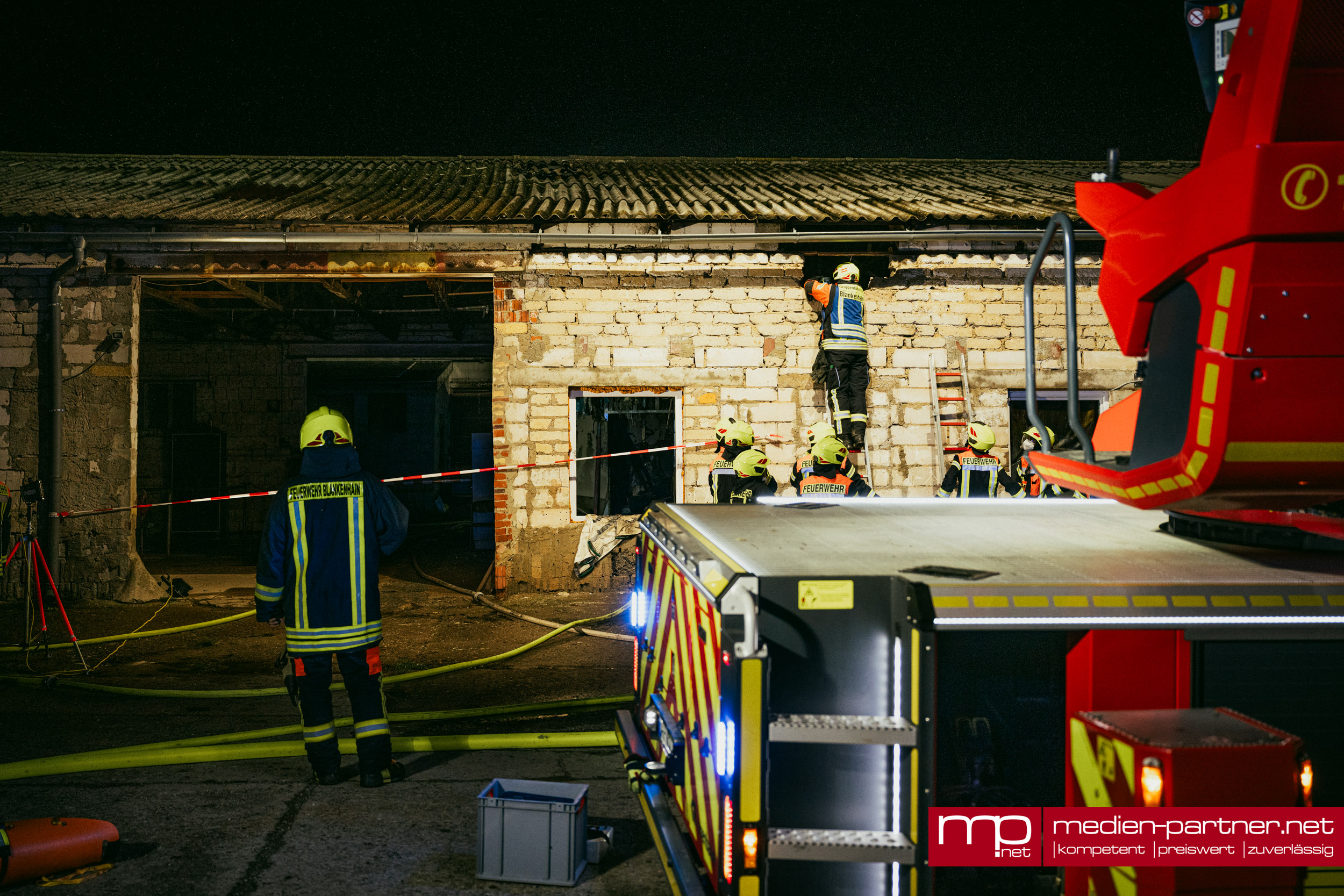 Besondere Vorsicht war wegen der verbauten Wellasbestplatten geboten. Um das Einatmen gefährlicher Stäube zu vermeiden, trugen die Feuerwehrkräfte auch FFP2-Masken. Auf das Einreißen des Daches wurde bewusst verzichtet.
