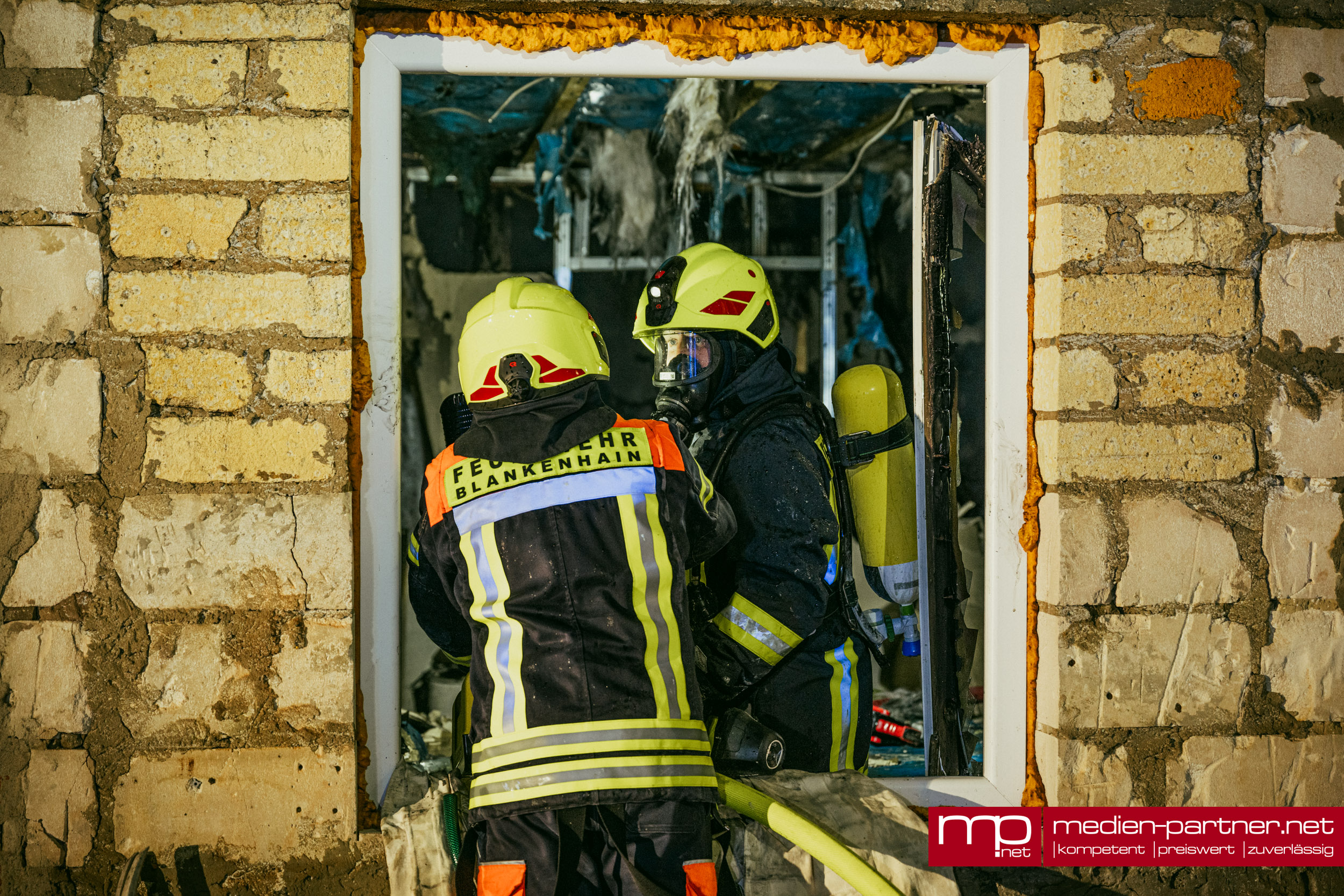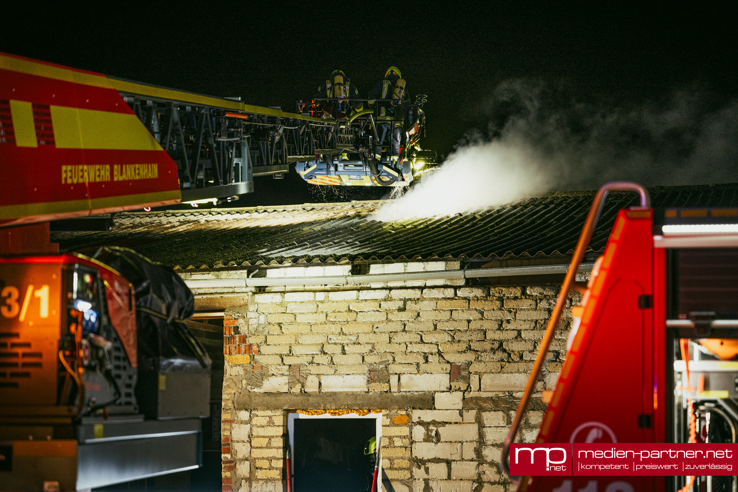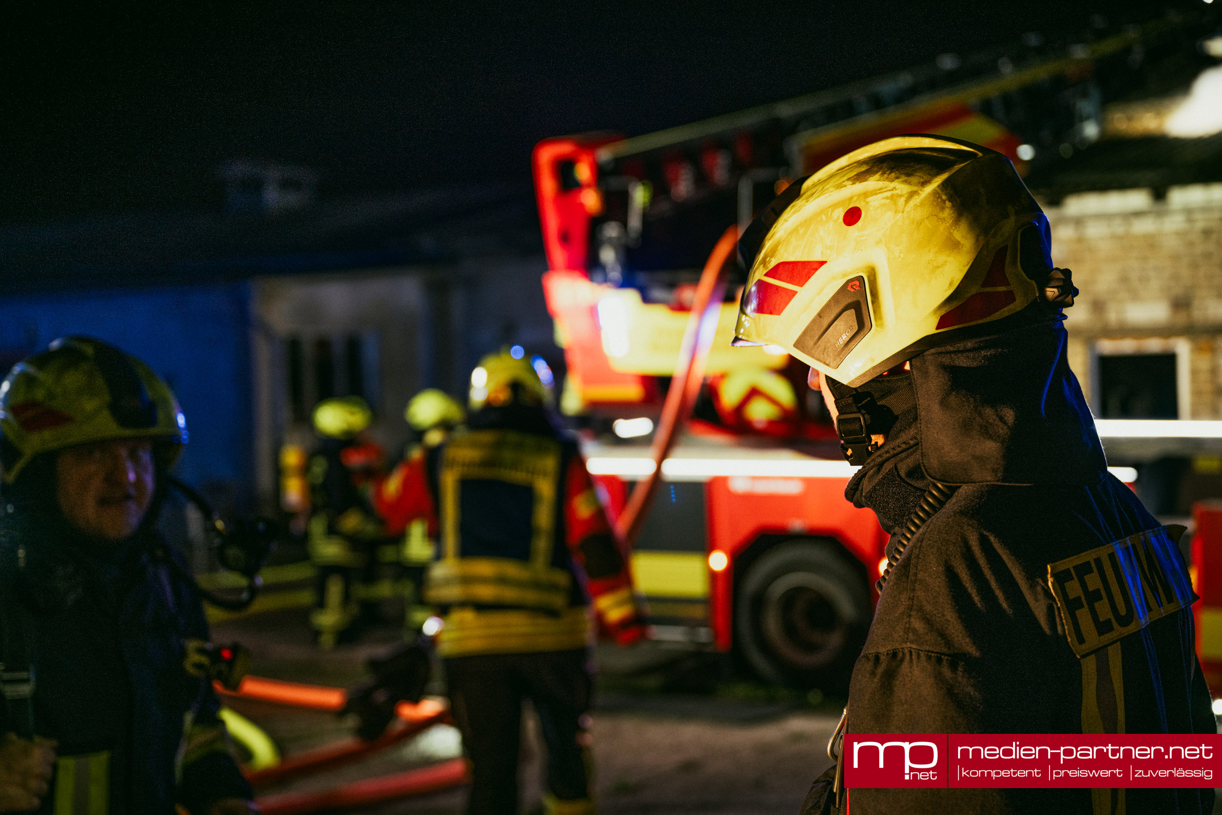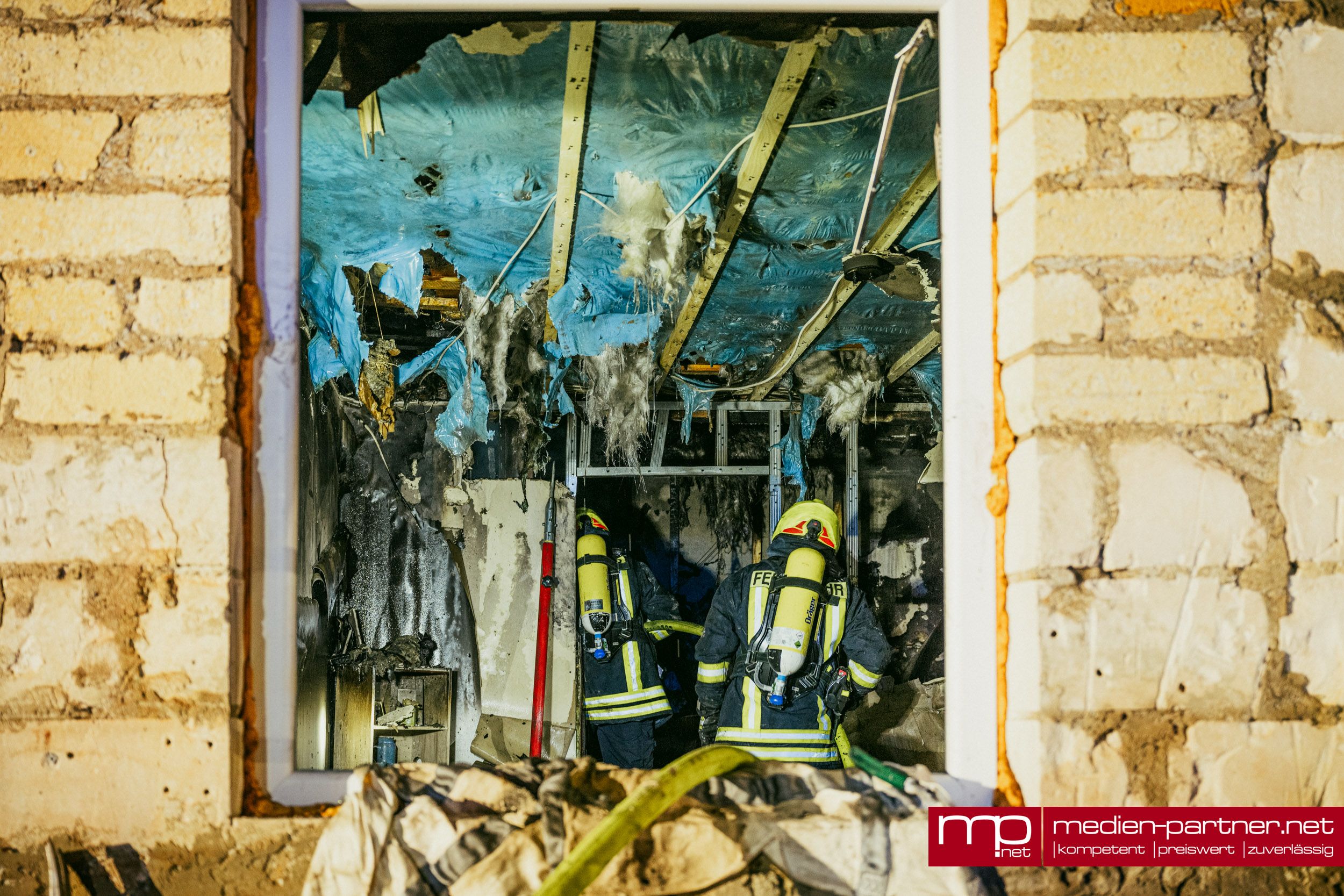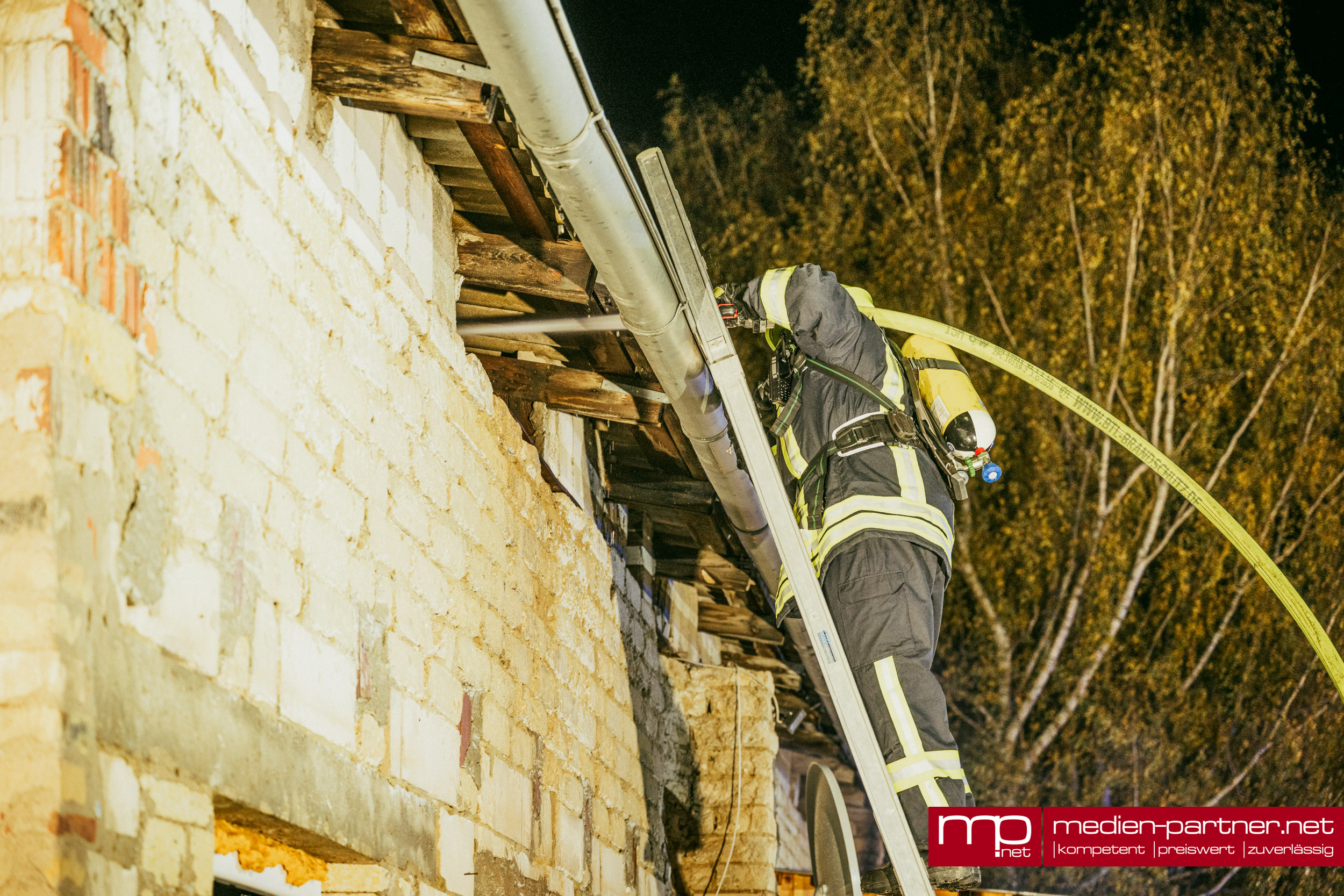 Im Verlauf der Löscharbeiten kam es im Dachstuhl zu einer Durchzündung, weshalb zusätzlich Wasser über die Drehleiter eingebracht wurde. Kurzzeitig mussten die Einsatzkräfte zurückgezogen werden, da die Dachkonstruktion – eine Nagelbinderkonstruktion – als einsturzgefährdet galt. Nach einer Kontrolle stellte sich jedoch heraus, dass keine akute Gefahr bestand, da es sich um alte Schäden handelte.
