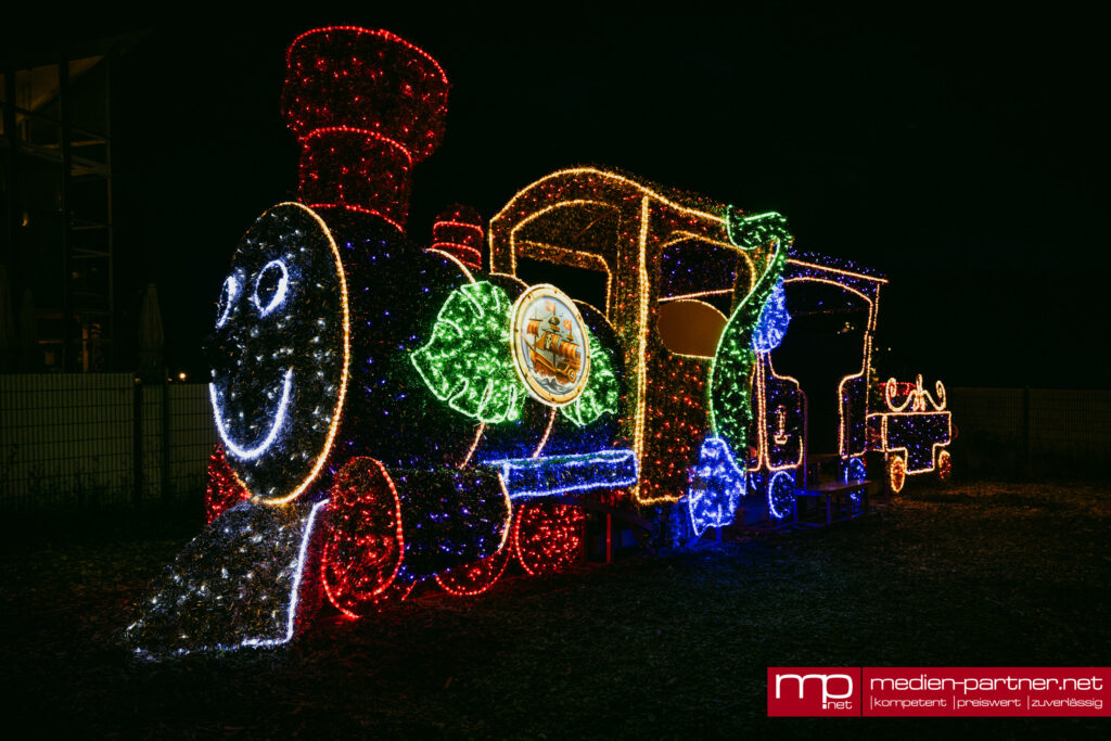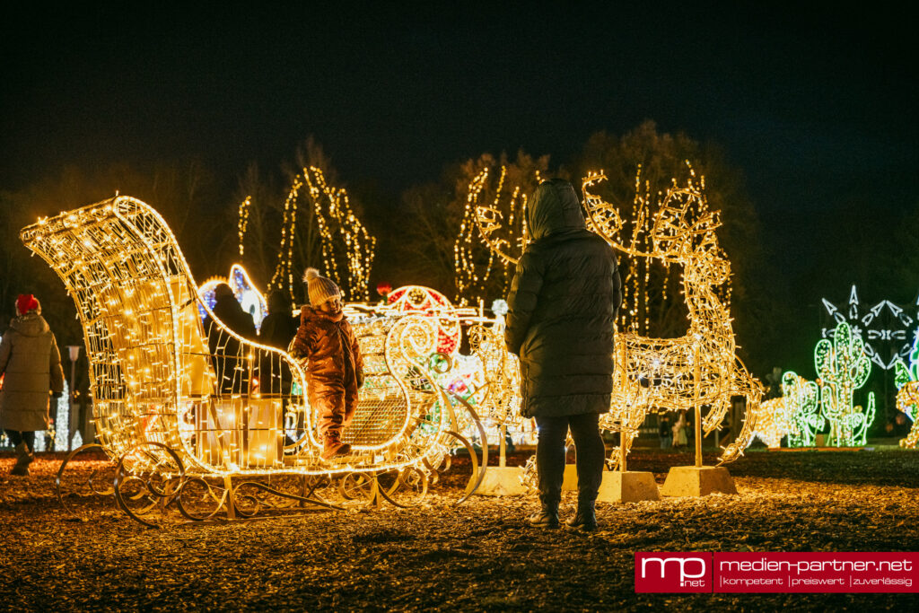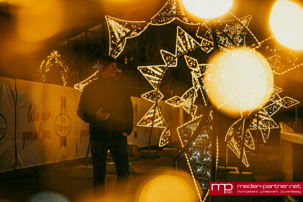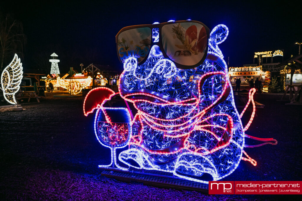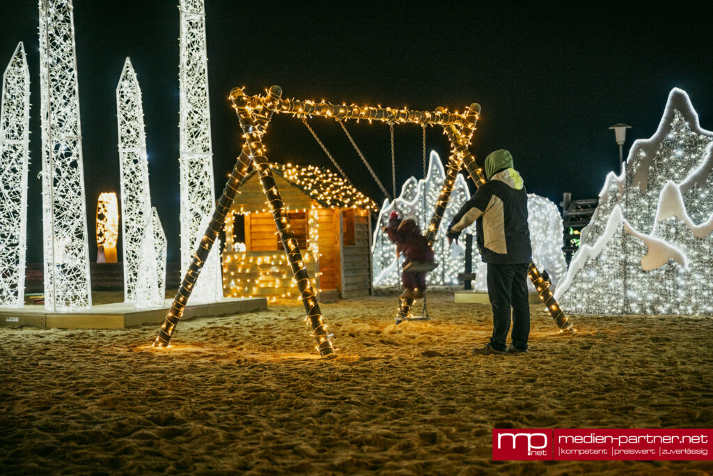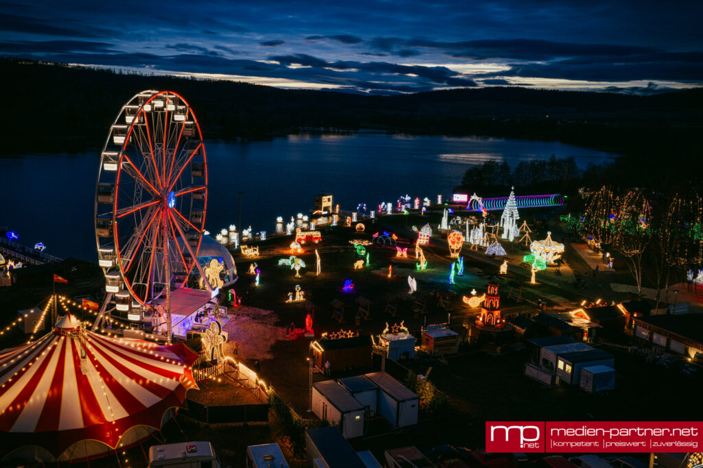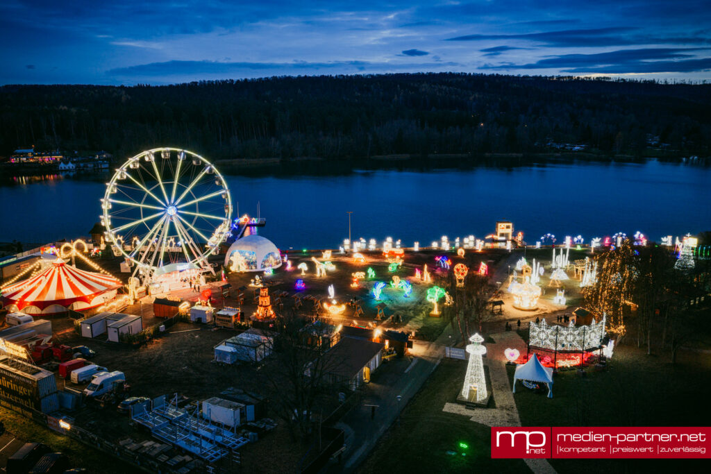 (Stausee Hohenfelden) Wenn am Stausee Hohenfelden die Temperaturen fallen und die Badestege verwaisen, erwacht das Gelände zu einem völlig neuen Leben: Die Glitzerwelt öffnete am Freitagnachmittag um 16.00 Uhr wieder ihre Tore – ein Wintererlebnis an einem Ort, der im Sommer ganz anderen Klängen folgt. Wo sonst Kinder über den Spielplatz toben, im See baden oder mit Tretbooten fahren, funkeln nun Millionen Lichter.