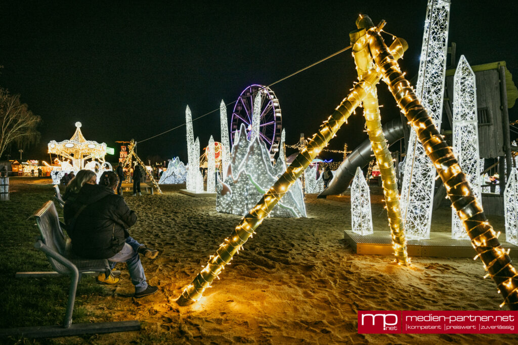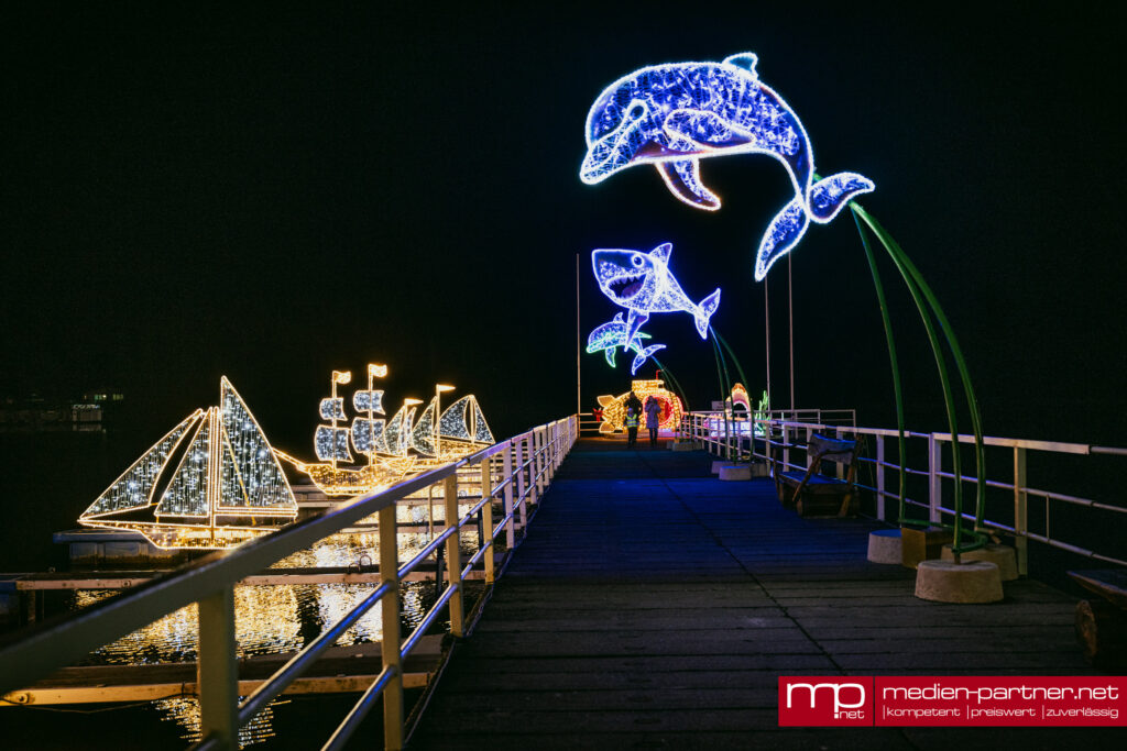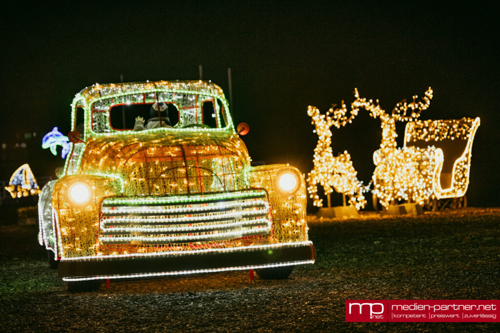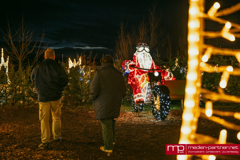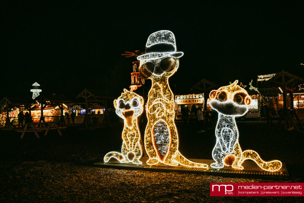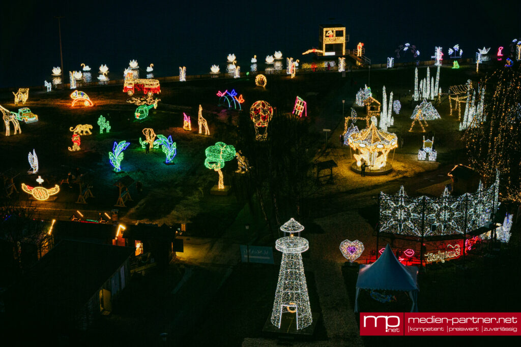 (Stausee Hohenfelden) Wenn am Stausee Hohenfelden die Temperaturen fallen und die Badestege verwaisen, erwacht das Gelände zu einem völlig neuen Leben: Die Glitzerwelt öffnete am Freitagnachmittag um 16.00 Uhr wieder ihre Tore – ein Wintererlebnis an einem Ort, der im Sommer ganz anderen Klängen folgt. Wo sonst Kinder über den Spielplatz toben, im See baden oder mit Tretbooten fahren, funkeln nun Millionen Lichter.