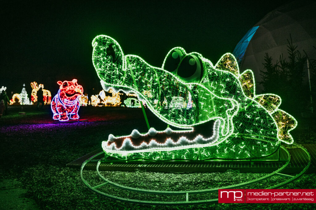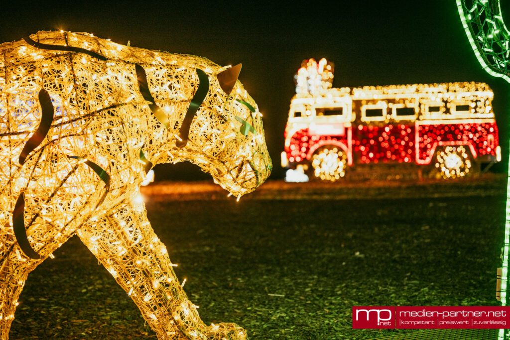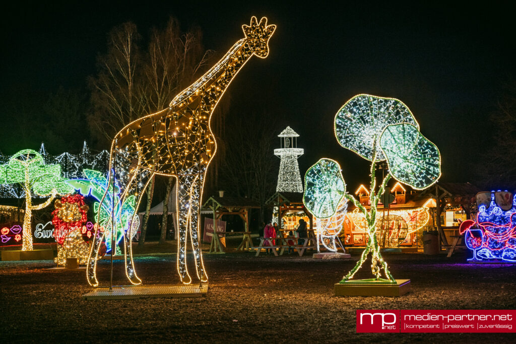 Ein zentrales Thema der diesjährigen Glitzerwelt ist die „Safari am See“. Entlang der Wege stehen neu gestaltete Leuchtfiguren: Giraffen, Löwen, Flusspferde und viele weitere Tiere, die extra für diese Saison angeschafft wurden. Die Veranstaltungsfläche umfasst rund 23.000 Quadratmeter – „genauso groß wie im letzten Jahr“, so Alke.