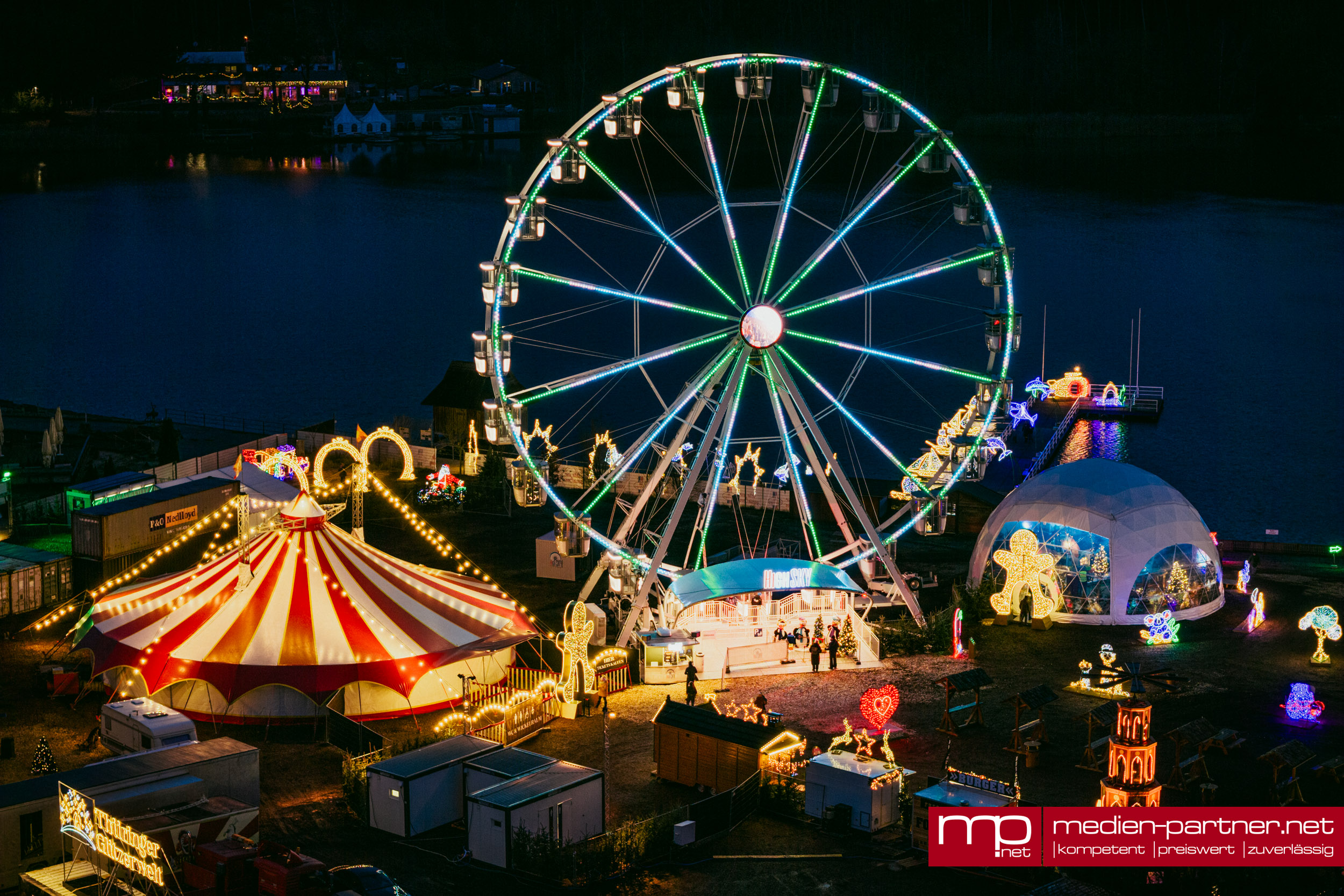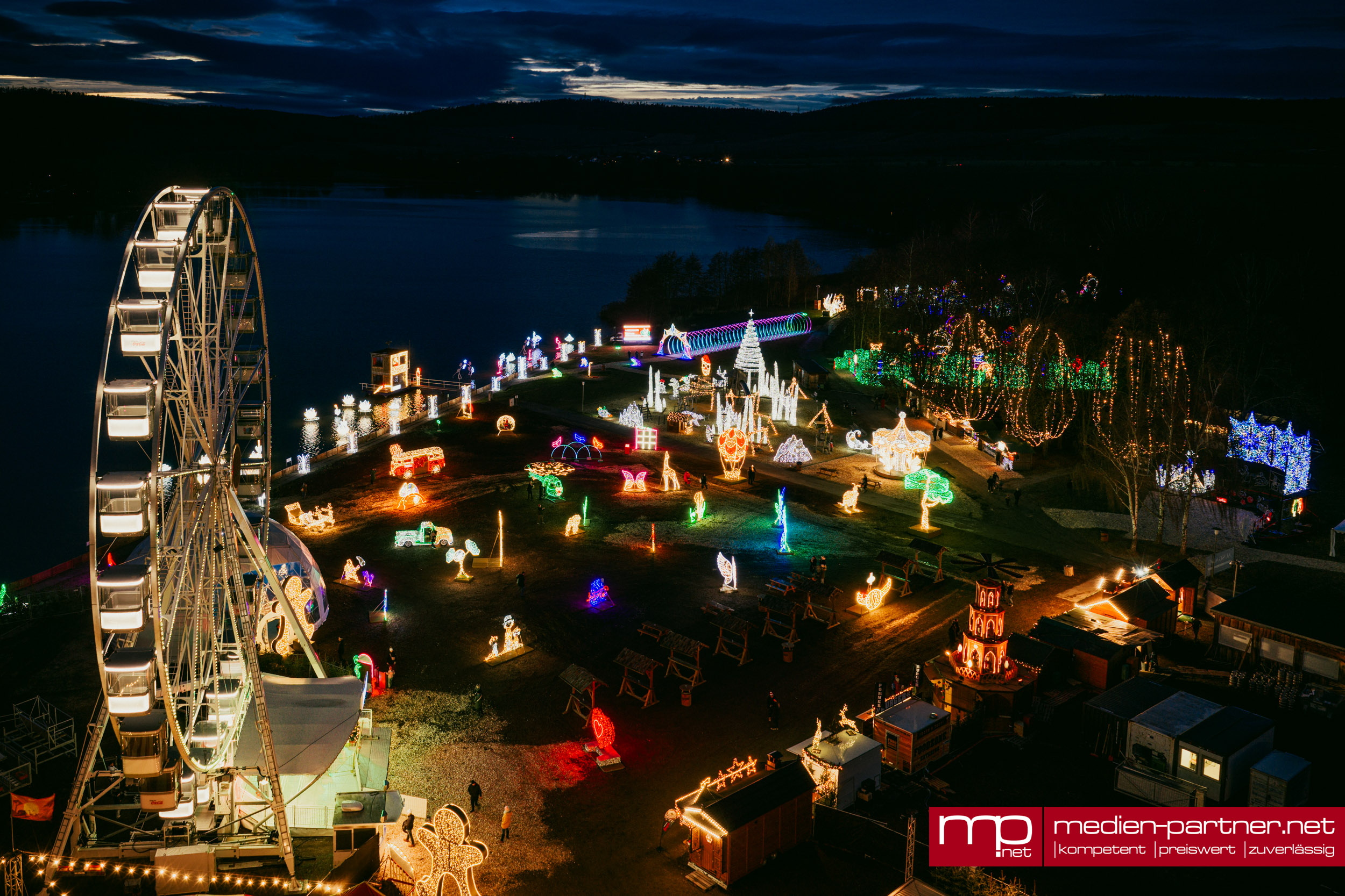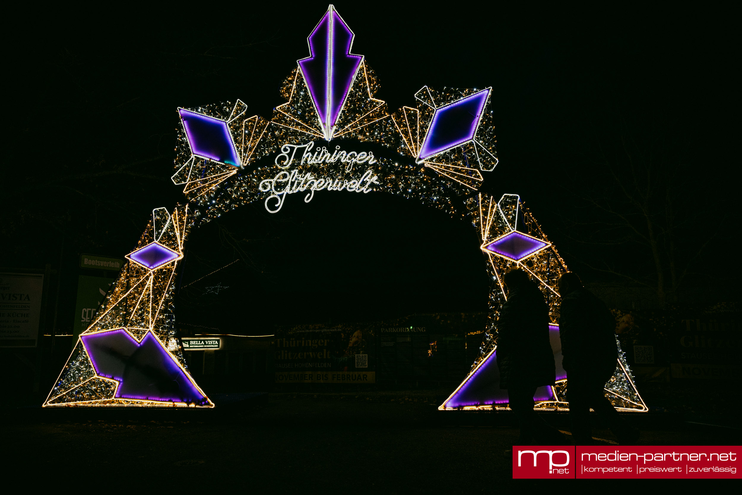 (Stausee Hohenfelden) Wenn am Stausee Hohenfelden die Temperaturen fallen und die Badestege verwaisen, erwacht das Gelände zu einem völlig neuen Leben: Die Glitzerwelt öffnete am Freitagnachmittag um 16.00 Uhr wieder ihre Tore – ein Wintererlebnis an einem Ort, der im Sommer ganz anderen Klängen folgt. Wo sonst Kinder über den Spielplatz toben, im See baden oder mit Tretbooten fahren, funkeln nun Millionen Lichter.