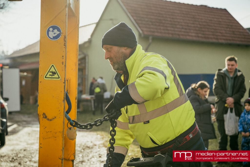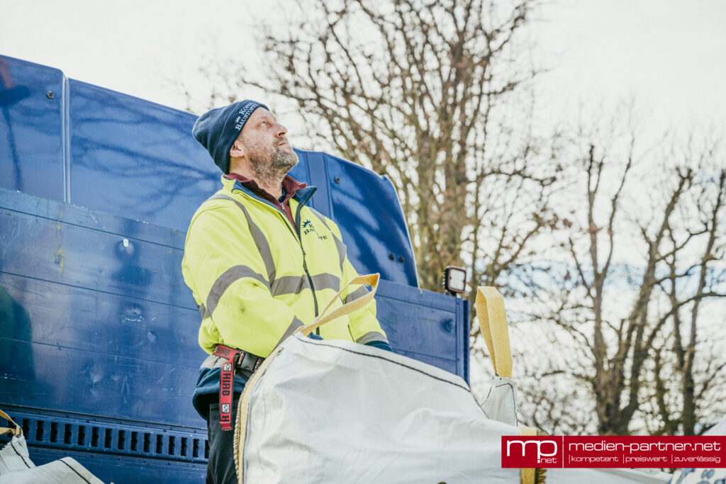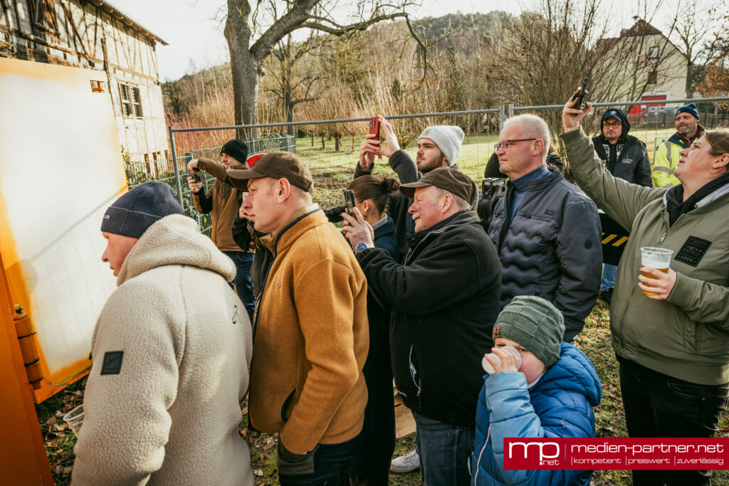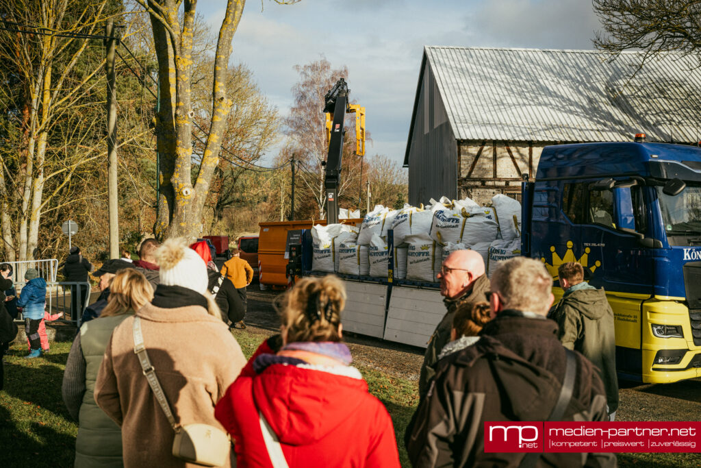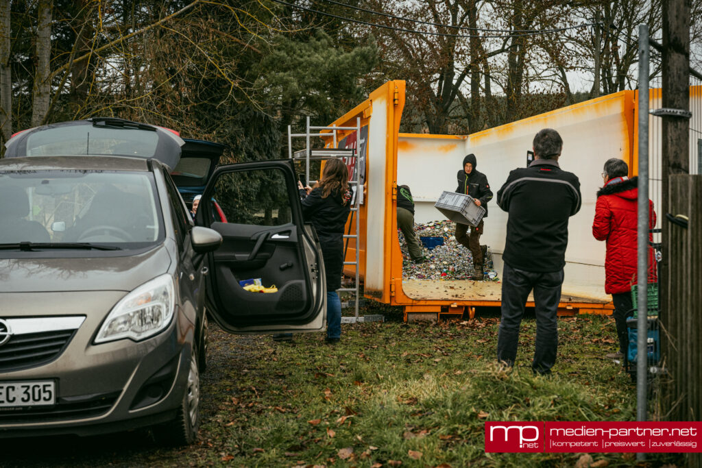 Einer der Höhepunkte war die Ankunft eines großen Lkw aus Rudolstadt. Der Baustoffhändler Jonas König, der seit Jahren als regionaler Partner sammelt, brachte allein 18 Big Packs voller Kronkorken mit – geschätzte sechs bis acht Tonnen Material. Mit einem Kran wurden die schweren Säcke angehoben und über dem Container entleert, was zahlreiche Schaulustige anlockte.