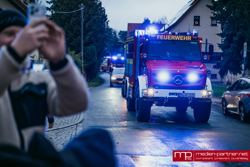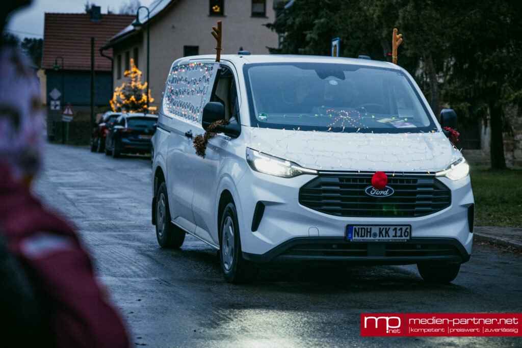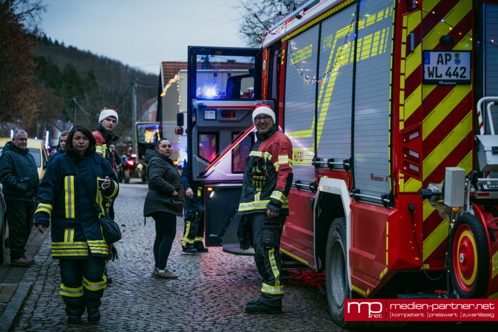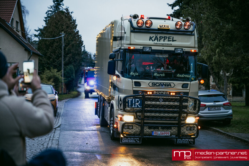 Am späten Nachmittag setzte sich die große Lichterfahrt in Bewegung. Geschmückte Lkw, Quads, Transporter, Feuerwehren und Privatfahrzeuge fuhren eine rund 30 Kilometer lange Strecke über Blankenhain, Bad Berka, Tonndorf und Tannroda zurück nach Thangelstedt.