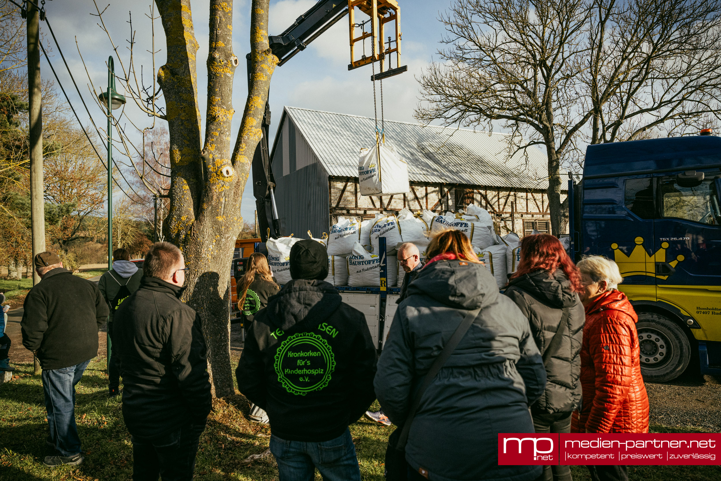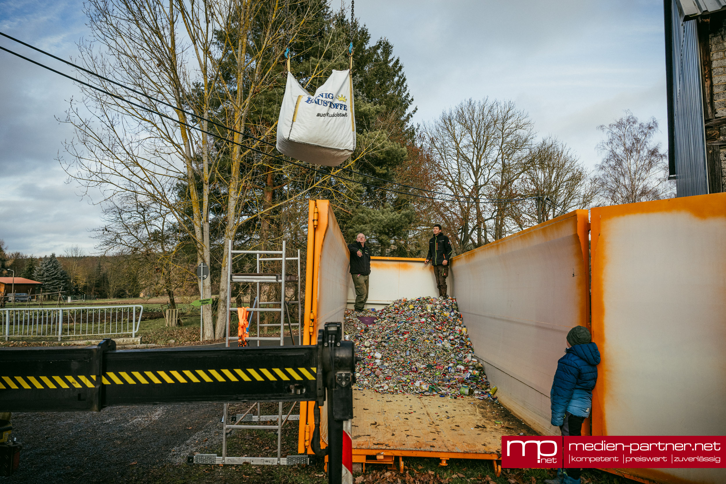 Einer der Höhepunkte war die Ankunft eines großen Lkw aus Rudolstadt. Der Baustoffhändler Jonas König, der seit Jahren als regionaler Partner sammelt, brachte allein 18 Big Packs voller Kronkorken mit – geschätzte sechs bis acht Tonnen Material. Mit einem Kran wurden die schweren Säcke angehoben und über dem Container entleert, was zahlreiche Schaulustige anlockte.