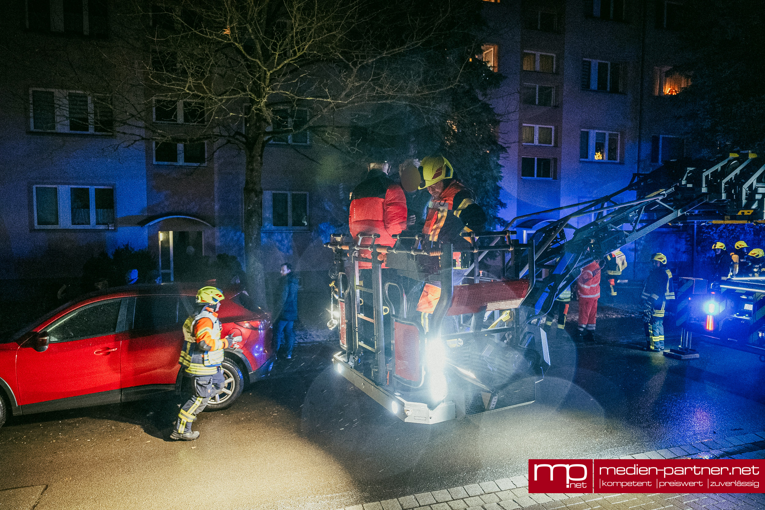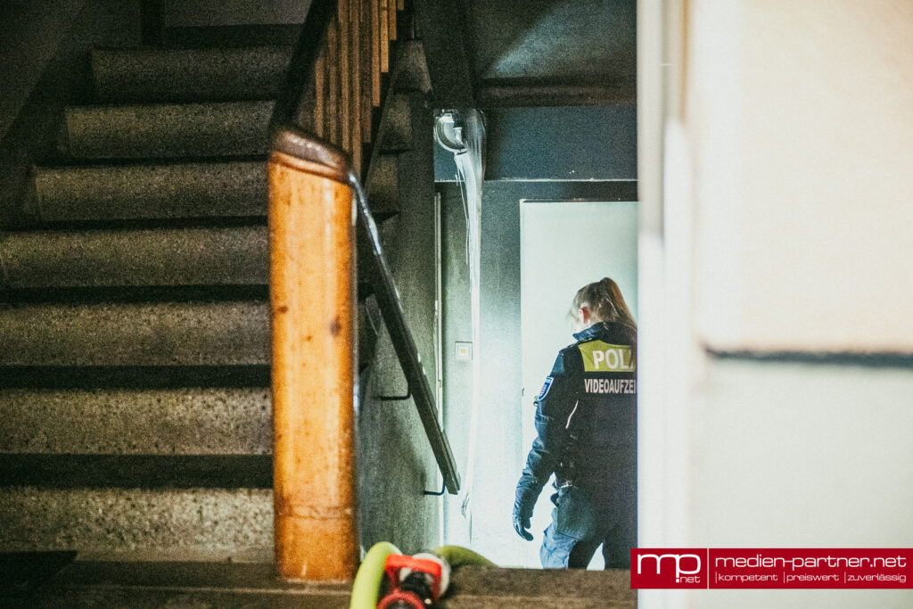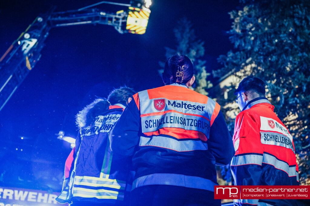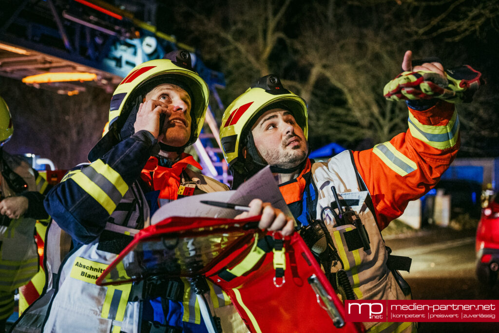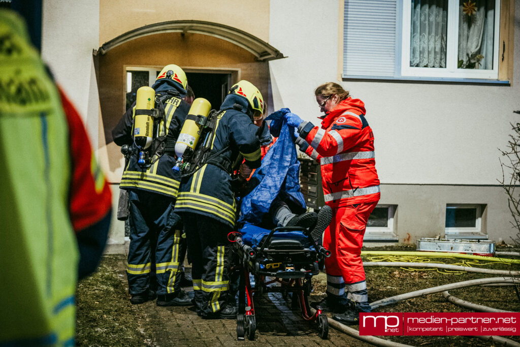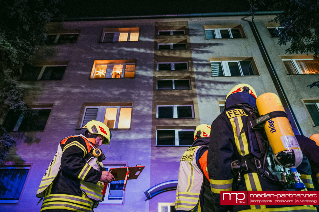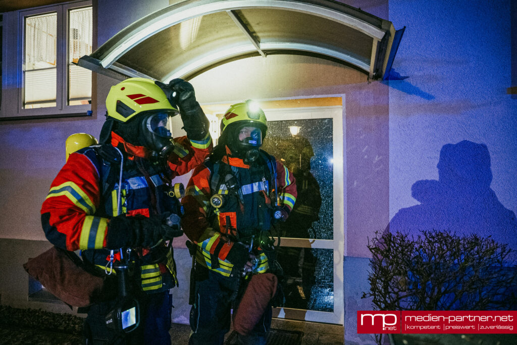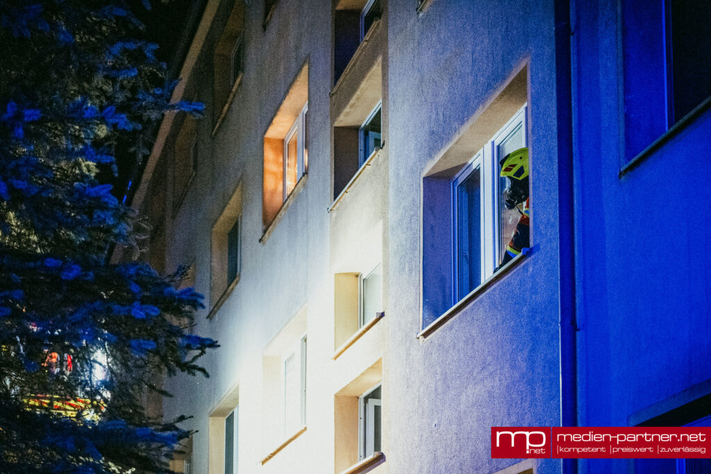 „Primär wurde die Personenrettung mittels Drehleiter durchgeführt. Atemschutztrupps brachten zudem Bewohner mit Fluchthauben durch die verrauchten Bereiche ins Freie“.