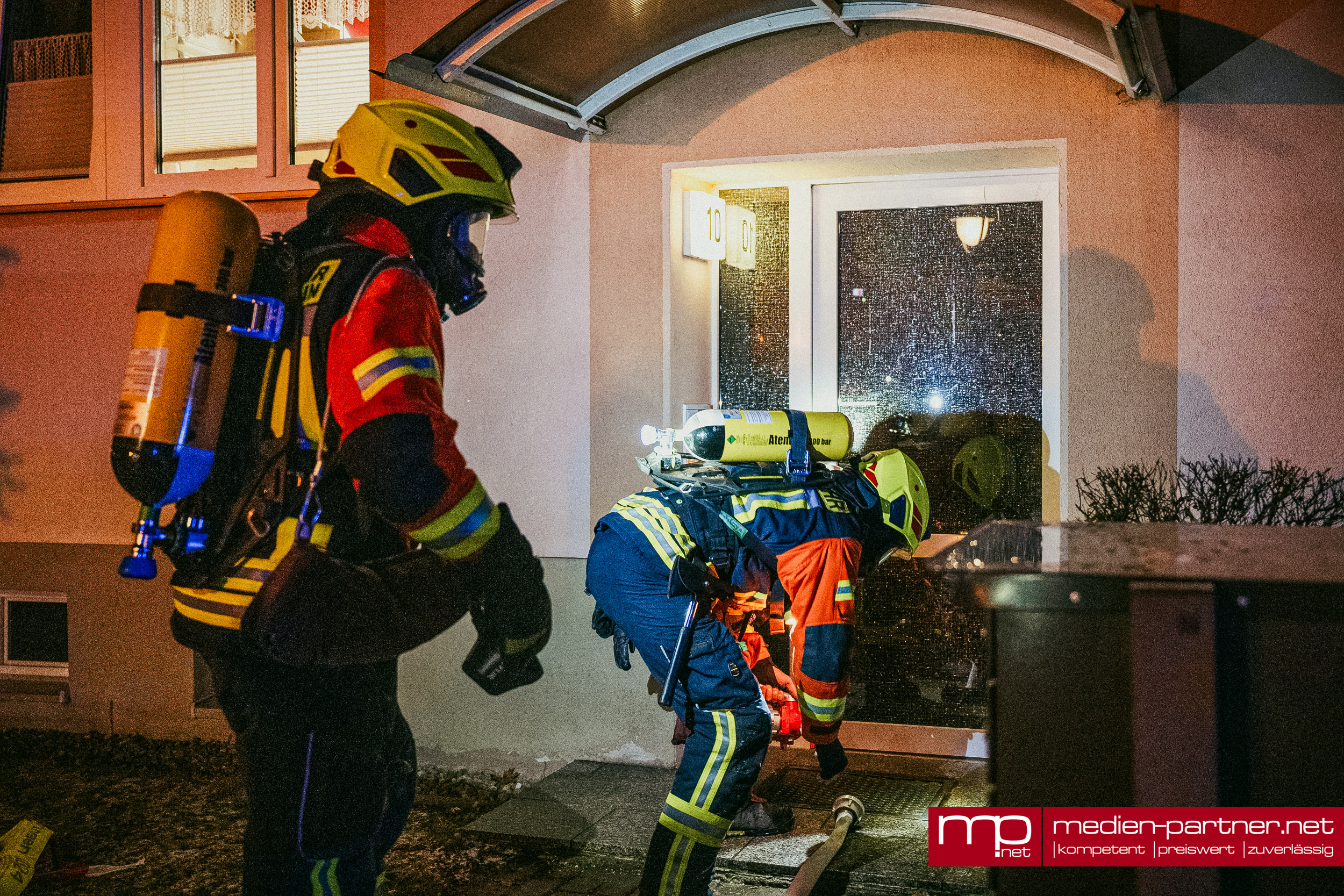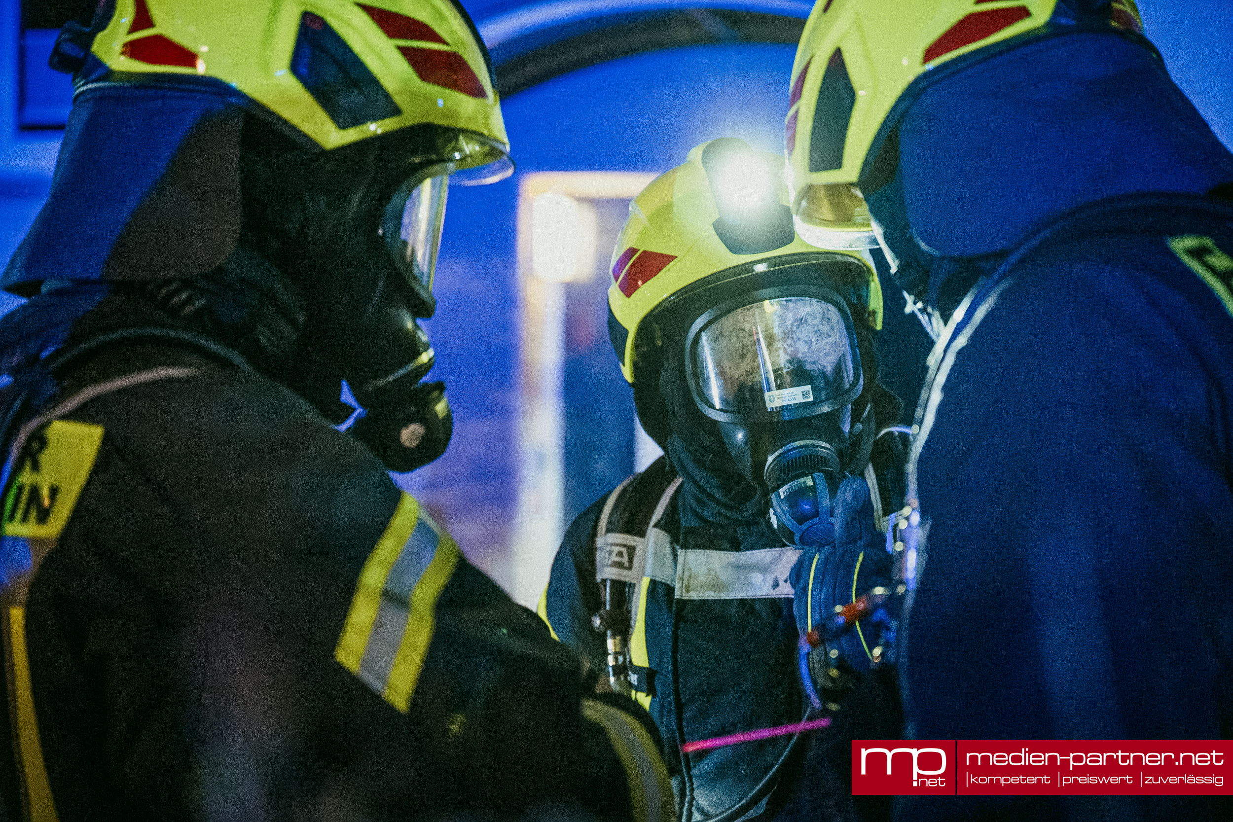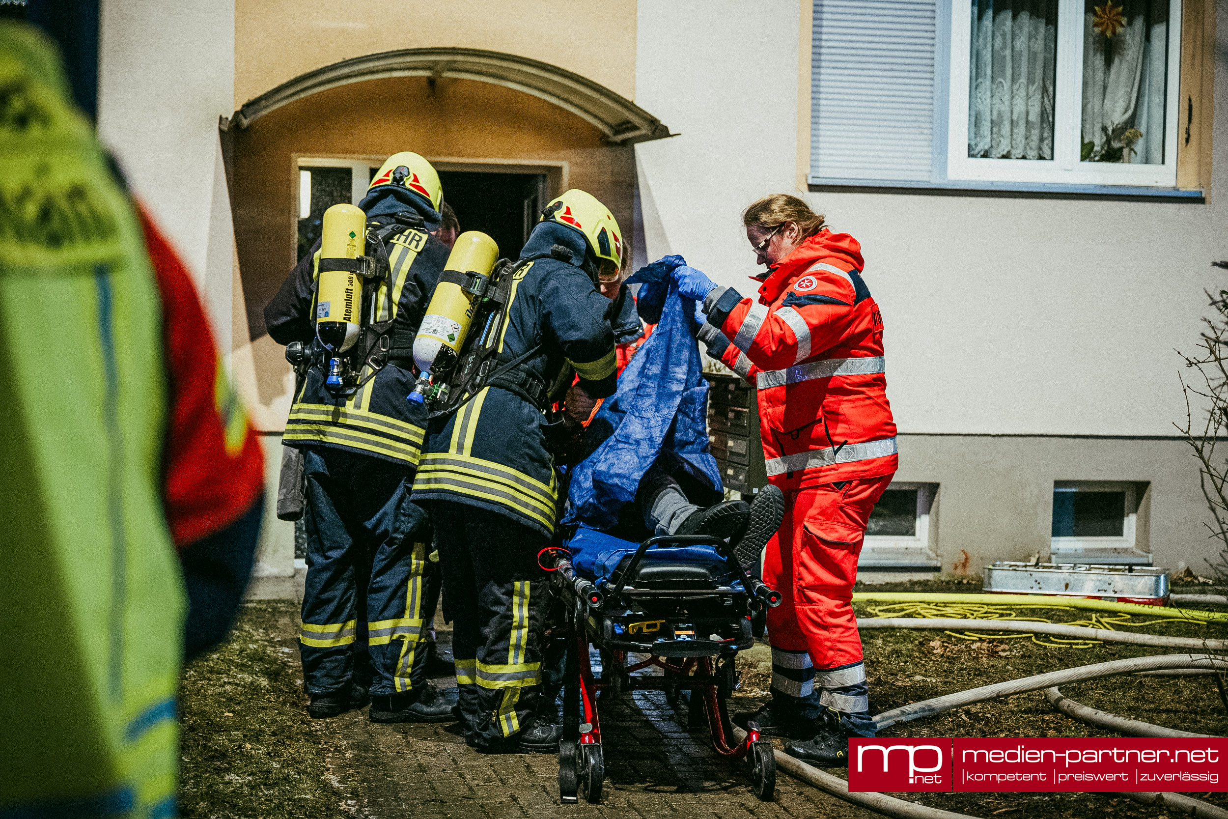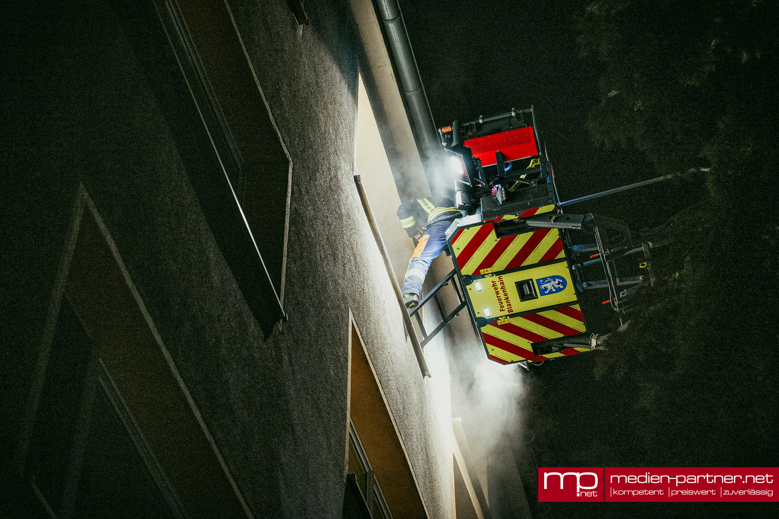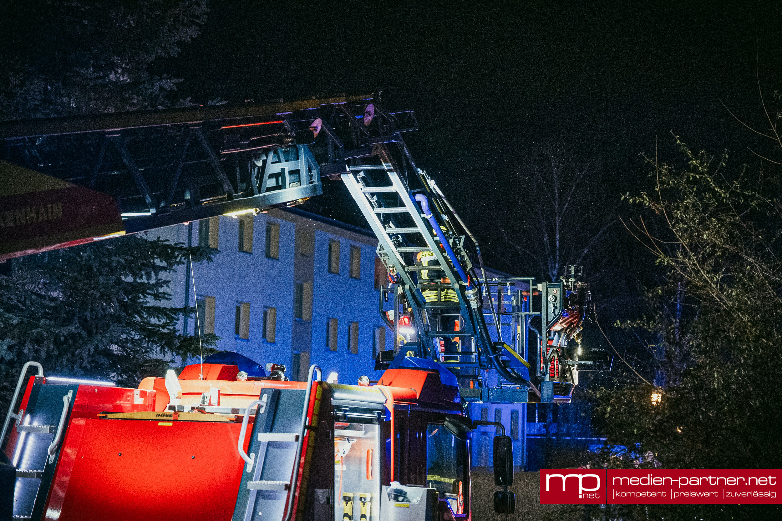 „Primär wurde die Personenrettung mittels Drehleiter durchgeführt. Atemschutztrupps brachten zudem Bewohner mit Fluchthauben durch die verrauchten Bereiche ins Freie“.
