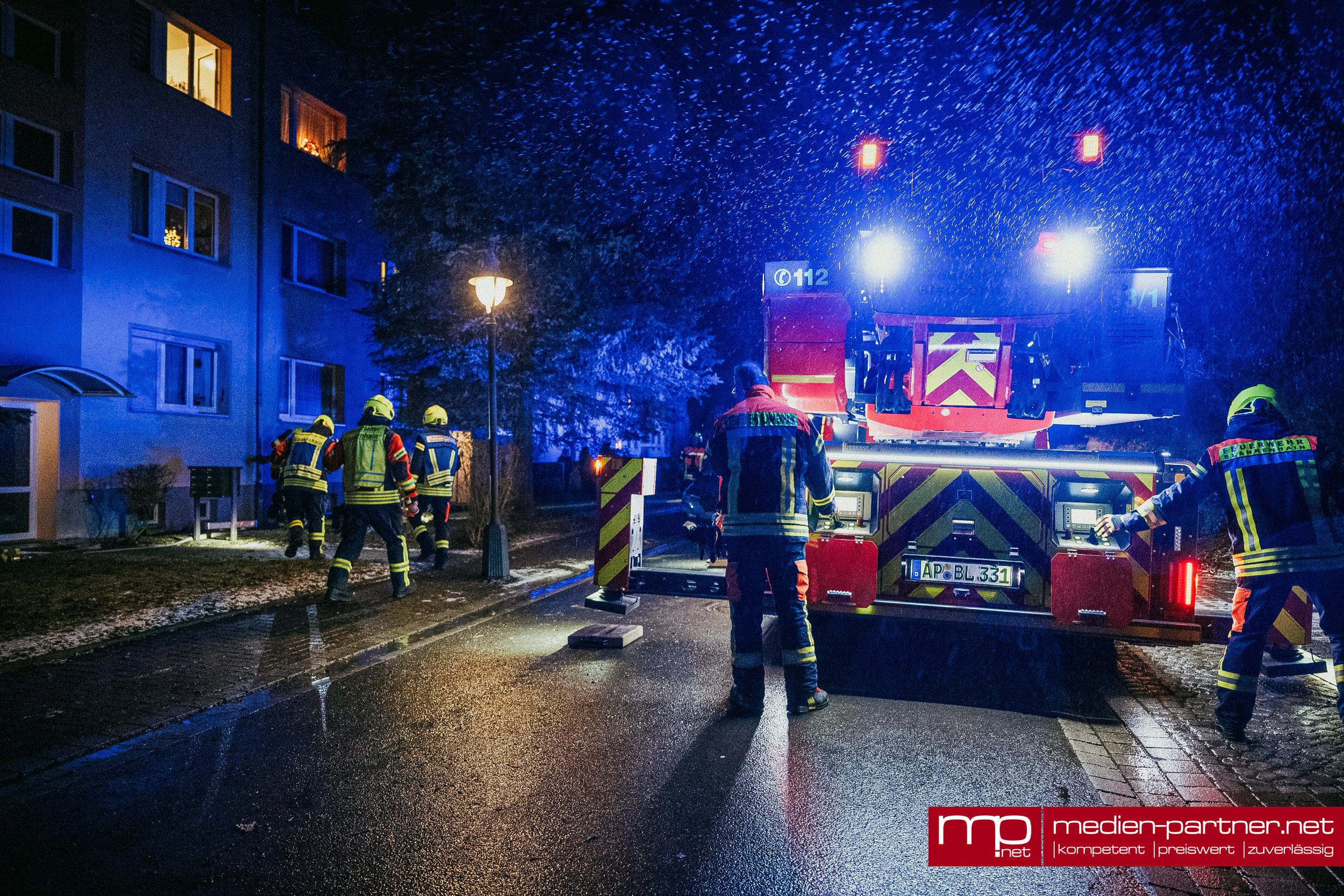 Auch der Neujahrsmorgen begann für die Feuerwehr ohne viel Schlaf. In den frühen Morgenstunden führte sie der Weg gegen 7.00 Uhr erneut in die Christian-Speck-Straße. Mieter hatten Hilfeschreie aus einer Wohnung gehört und den Notruf abgesetzt. Die Feuerwehr verschaffte sich mittels einer Nottüröffnung gewaltsam Zutritt zur Wohnung, um eine medizinische Notversorgung der hilflosen Person zu ermöglichen.