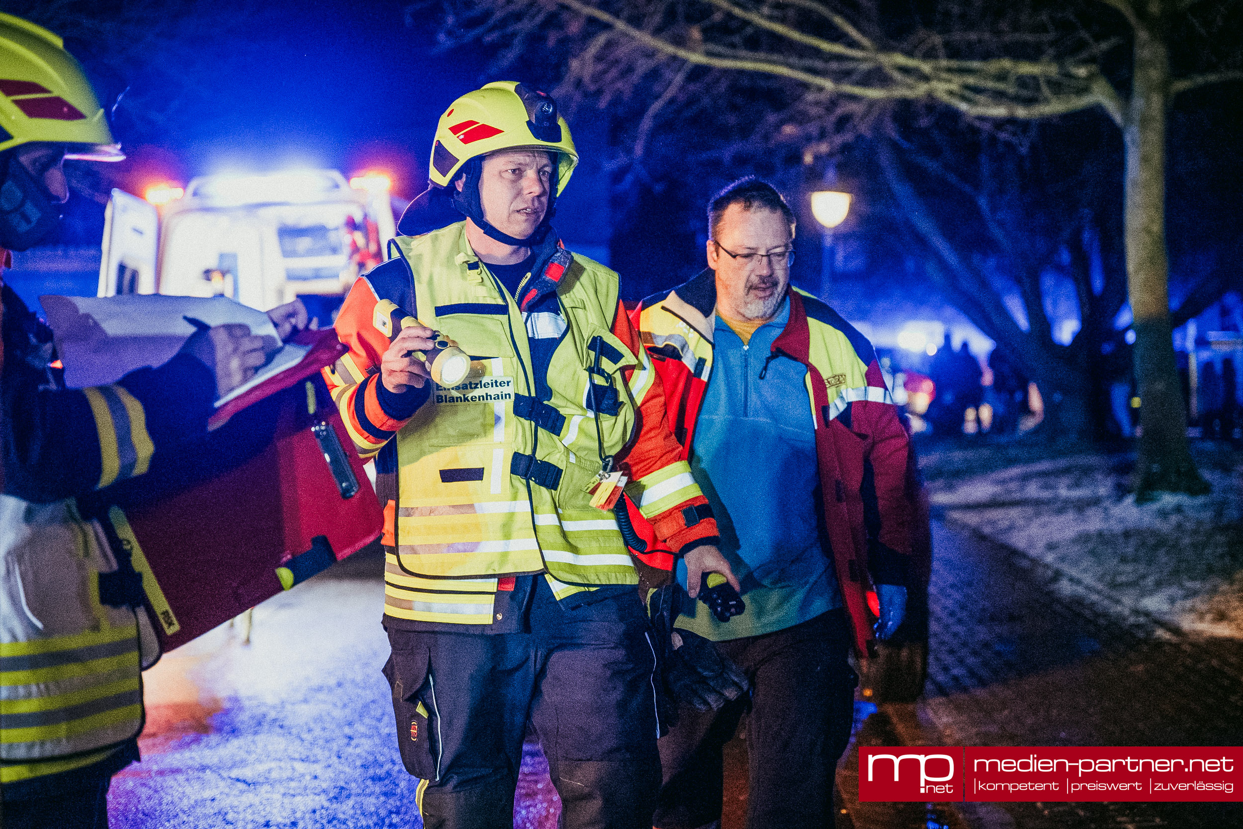 (Blankenhain) Während die meisten Bürger den Jahreswechsel vorbereiteten oder feierten, erlebten die Rettungskräfte in Blankenhain eine der intensivsten Silvesternächte der letzten Jahre. Ein Großeinsatz wegen eines Kellerbrands, ein brennender Baum und eine lebensrettende Nottüröffnung forderten die Kameraden bis in die Morgenstunden des Neujahrstages.