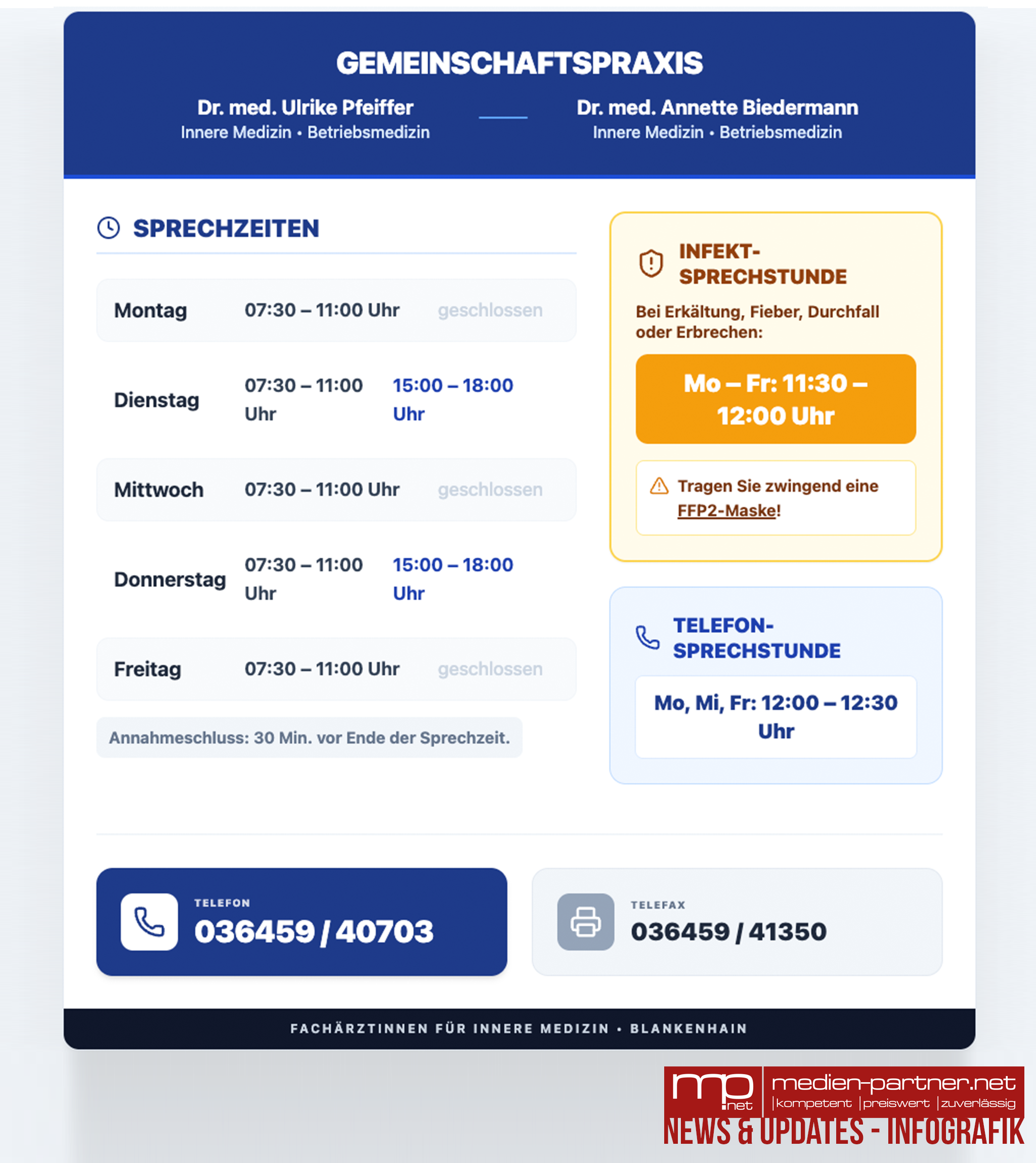 Parallel dazu vollzieht sich in der Praxis von Frau Dr. med. Annette Biedermann ein geplanter Generationenwechsel. Die Fachärztin für Innere Medizin Betriebsmedizin hat die Leitung an ihre Nachfolgerin, Frau Dr. Pfeiffer, übergeben, bleibt dem Team aber als angestellte Ärztin bis zum Sommer erhalten. Das bewährte Leistungsspektrum, insbesondere die Betriebsmedizin für Feuerwehren und regionale Betriebe sowie die Fahrtauglichkeitsuntersuchungen für Lkw-Fahrer, bleibt vollumfänglich bestehen.