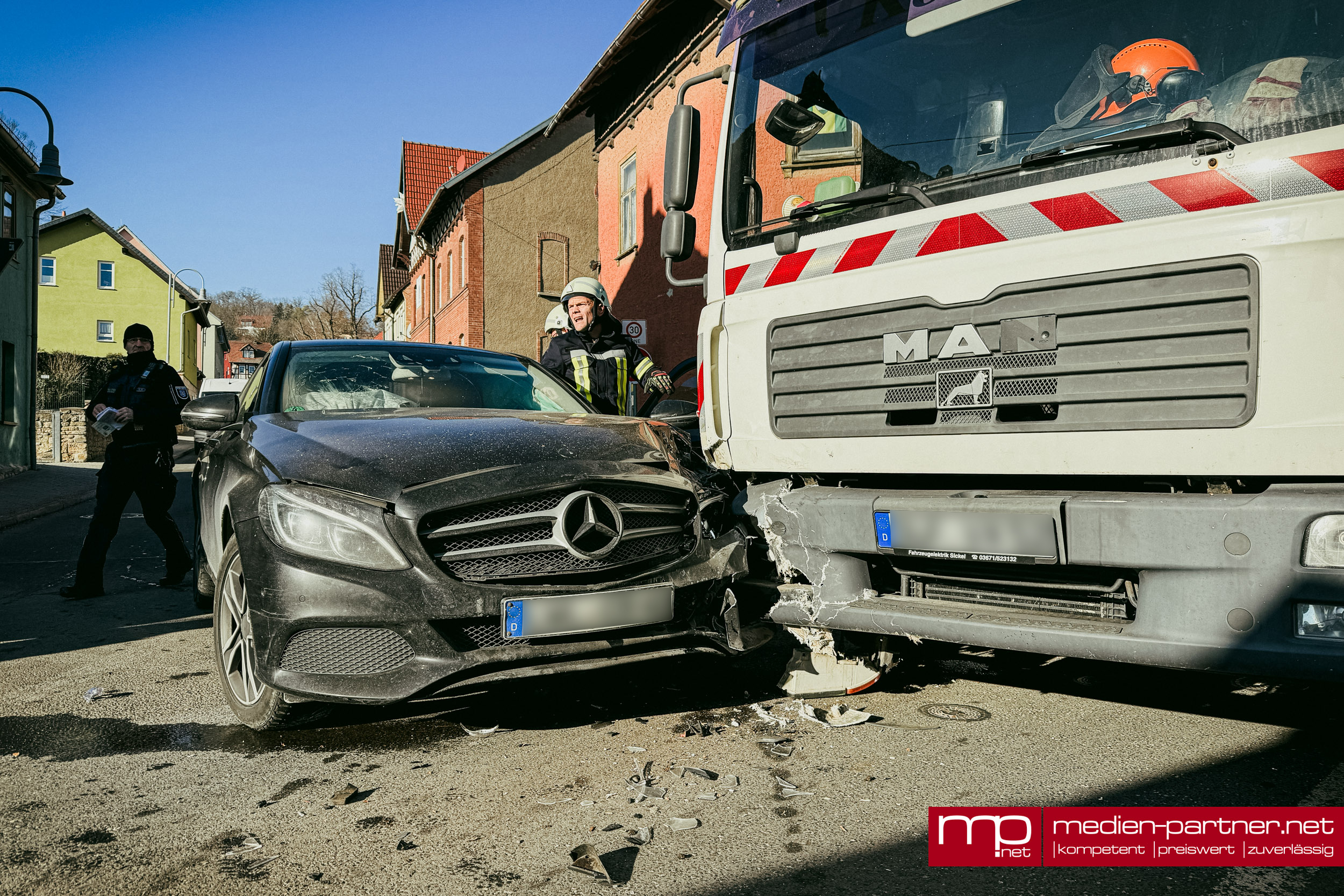Die Feuerwehr Kranichfeld sicherte die Unfallstelle ab, stellte den Brandschutz sicher und beräumte die Fahrbahn. Für die Dauer der Rettungsarbeiten und die Unfallaufnahme musste die Alexanderstraße voll gesperrt werden.