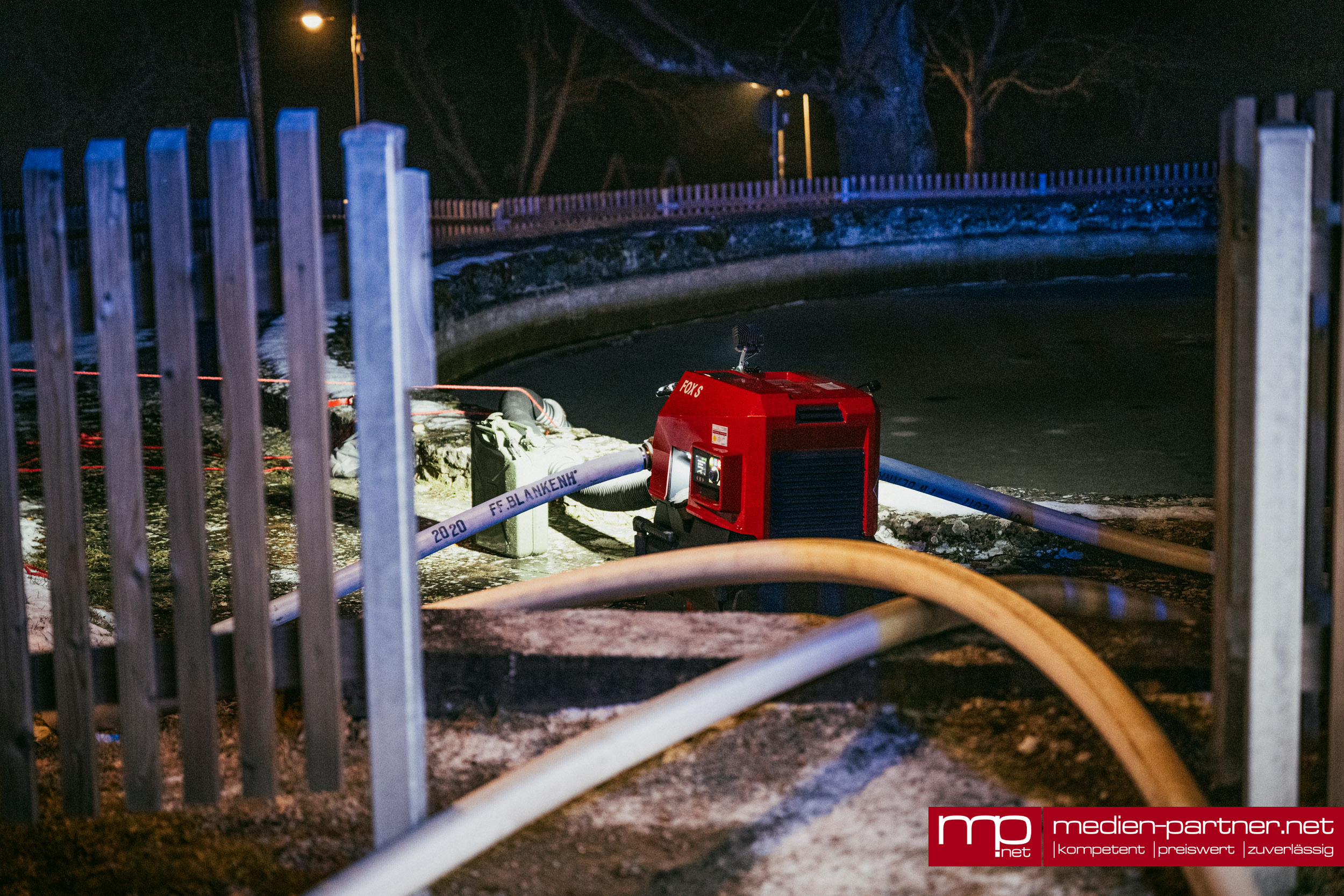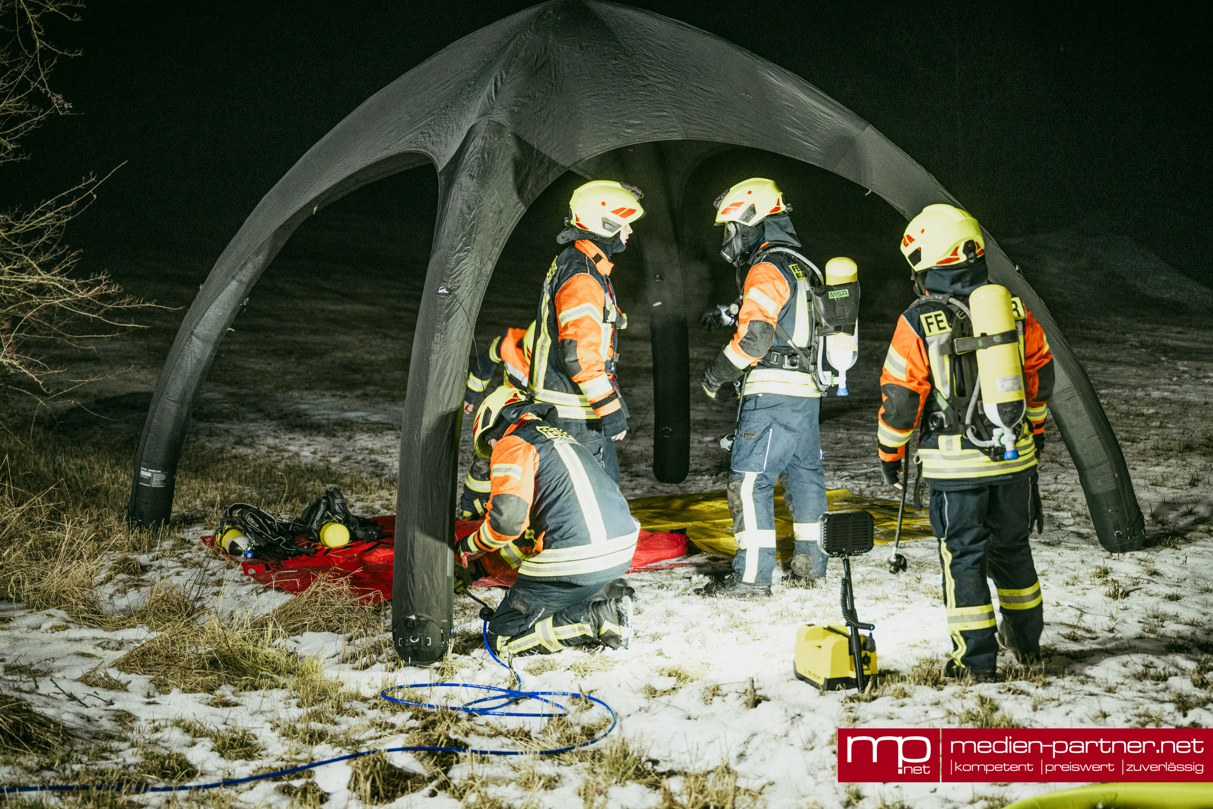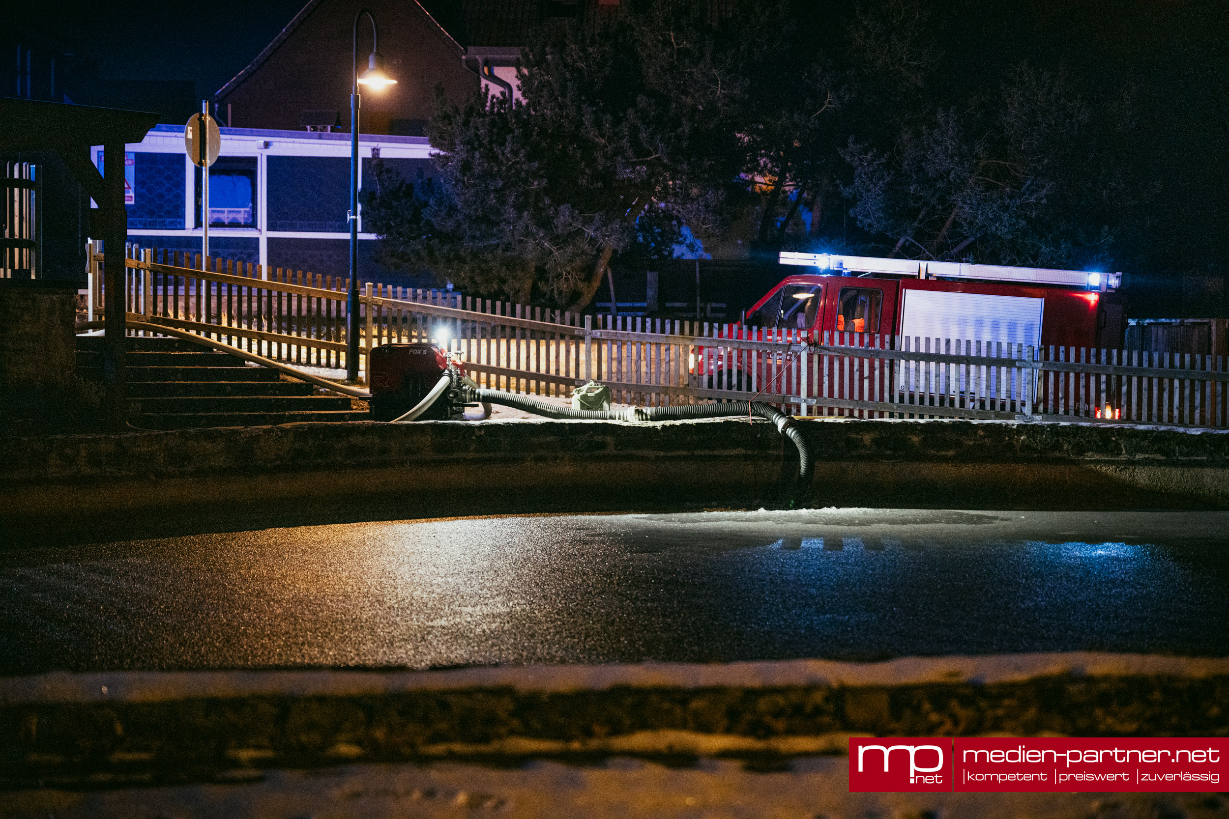 Die Situation vor Ort war von Beginn an kritisch. Da das Gebäude voll in Flammen stand, war ein Betreten für die Feuerwehrleute unmöglich. Die Einsatzkräfte mussten zudem unter zunehmend extremen Bedingungen arbeiten: Bei Temperaturen von bis zu -12 Grad in den Morgenstunden fror die Ausrüstung teilweise ein. „Wir müssen die Schlauchleitungen immer im Fluss halten, damit uns die Strahlrohre nicht einfrieren“, schilderte Einsatzleiter Marcus Köhler die technische Herausforderung. Die Wasserversorgung wurde mühsam über eine doppelte lange Wegestrecke vom Dorfteich aus aufgebaut.