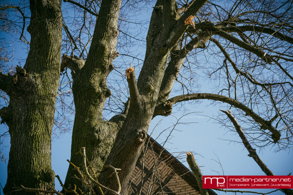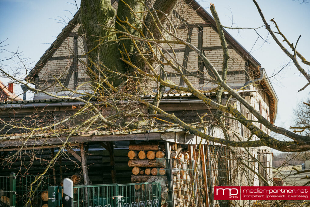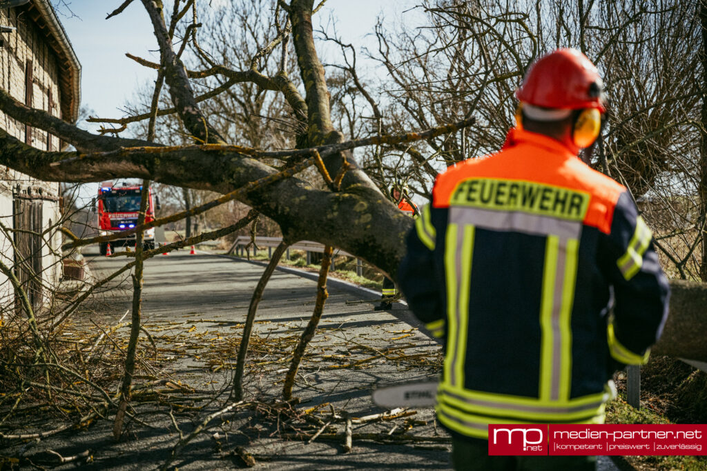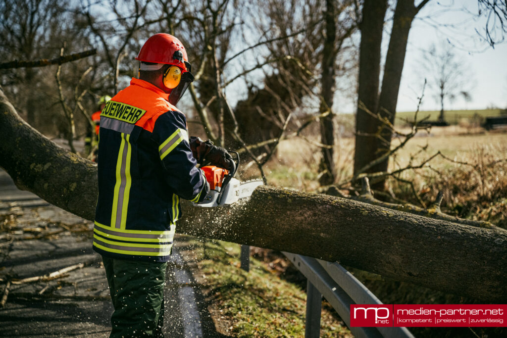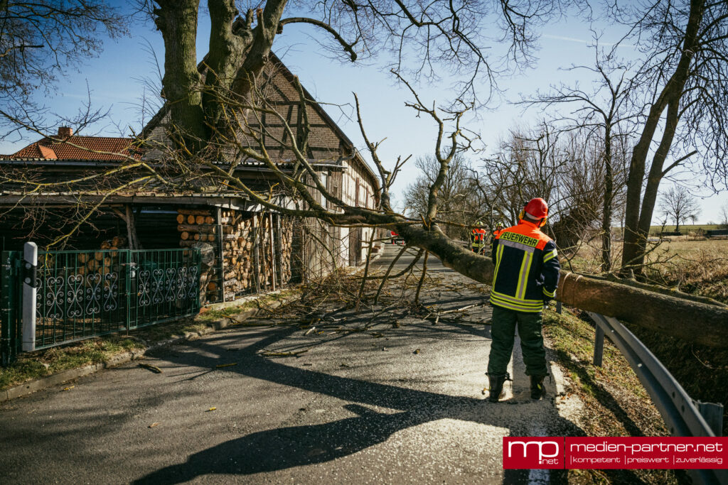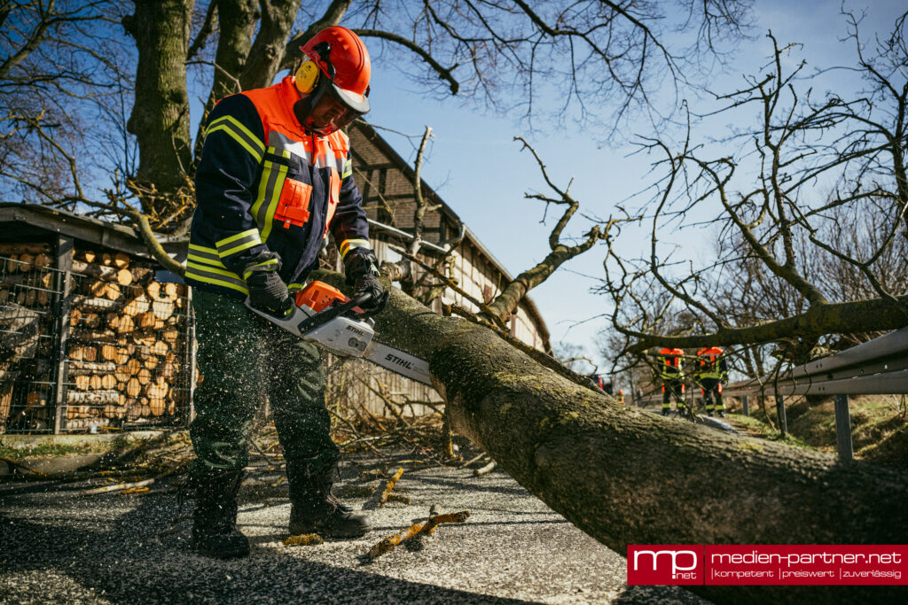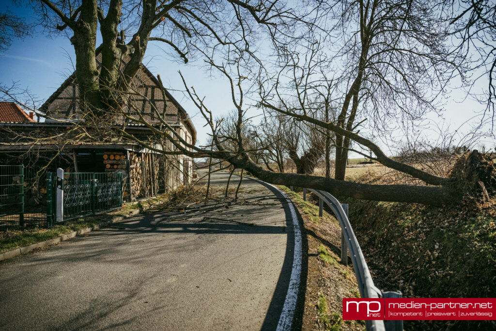 Der große Baum war infolge des anhaltenden Windes entwurzelt worden und quer über die Fahrbahn gestürzt. Besonders heikel: Die Krone des Baumes landete direkt auf dem Schleppdach eines privaten Holzlagers.