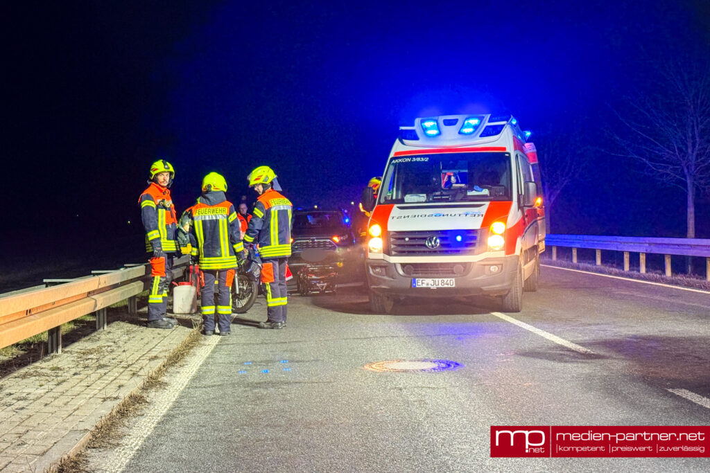 Neben dem Rettungsdienst waren auch die Polizei und die Freiwillige Feuerwehr Blankenhain im Einsatz. Die Feuerwehrleute sicherten die Unfallstelle ab, banden auslaufende Betriebsflüssigkeiten ab und kehrten die Trümmerteile zusammen.